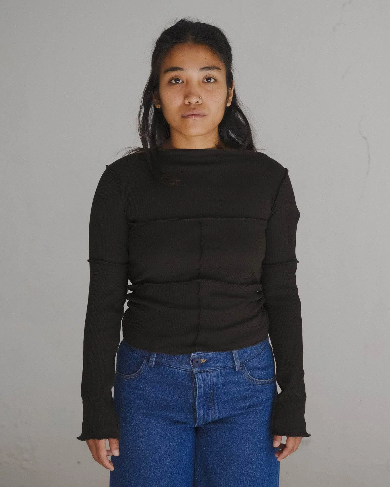 Product Details Recycled cotton rib long sleeve Boat neck Exposed seams Lettuce edge at hems 60% Recycled Cotton 40% Cotton Made in Portugal Model wears a size S and is 155cm Material Recycled Cotton Origin: Portugal, Spain, India Certifications: GRS, Oeko-tex - Recycled cotton is made from pre-consumer textiles such as cotton scraps, factory offcuts, or deadstock from virgin cotton fabric production. - Recycled cotton is often paired with virgin cotton to improve the quality of the finished fabric, as recycled cotton often has lesser yarn strength. - Making recycled cotton uses less energy, dye, and water than virgin materials. - It also reduces the amount of fabric going into landfill and keeps materials in circulation for longer.
