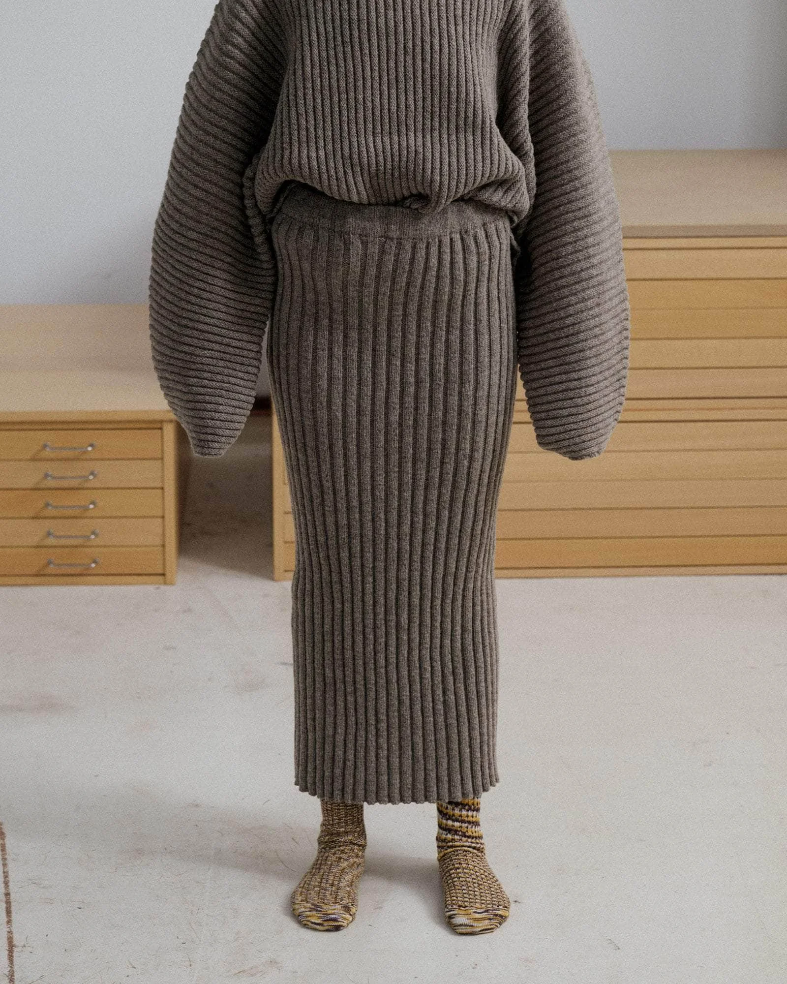 Product Details Arles Merino Wool rib skirt Elastic waistband 100% Arles Merino Wool Made in France Model wears a size S Material Arles Merino Wool Origin: France Certificates: Oeko-tex - Arles Sheep is a breed of sheep that produces Merino Wool, which developed in the South of France. - Most of the sheep are used for their milk and meat. - A large chunk of the wool today is wasted, as wool production has moved to Australia and South Africa where costs are lower. Breeders don’t have enough spinners buying their wool anymore, so the wool often remains unused. - Some small local workshops in the area still use the wool recognized for its notable curliness. - Like regular sheep wool, the fiber is biodegradable and comes from a renewable source. - It absorbs moisture without feeling wet or cold, is antibacterial and has odor-fighting properties. - Wool also regulates body temperature and is breathable. - The natural crimps of wool allow the fabric to maintain its shape well and endure stretching.