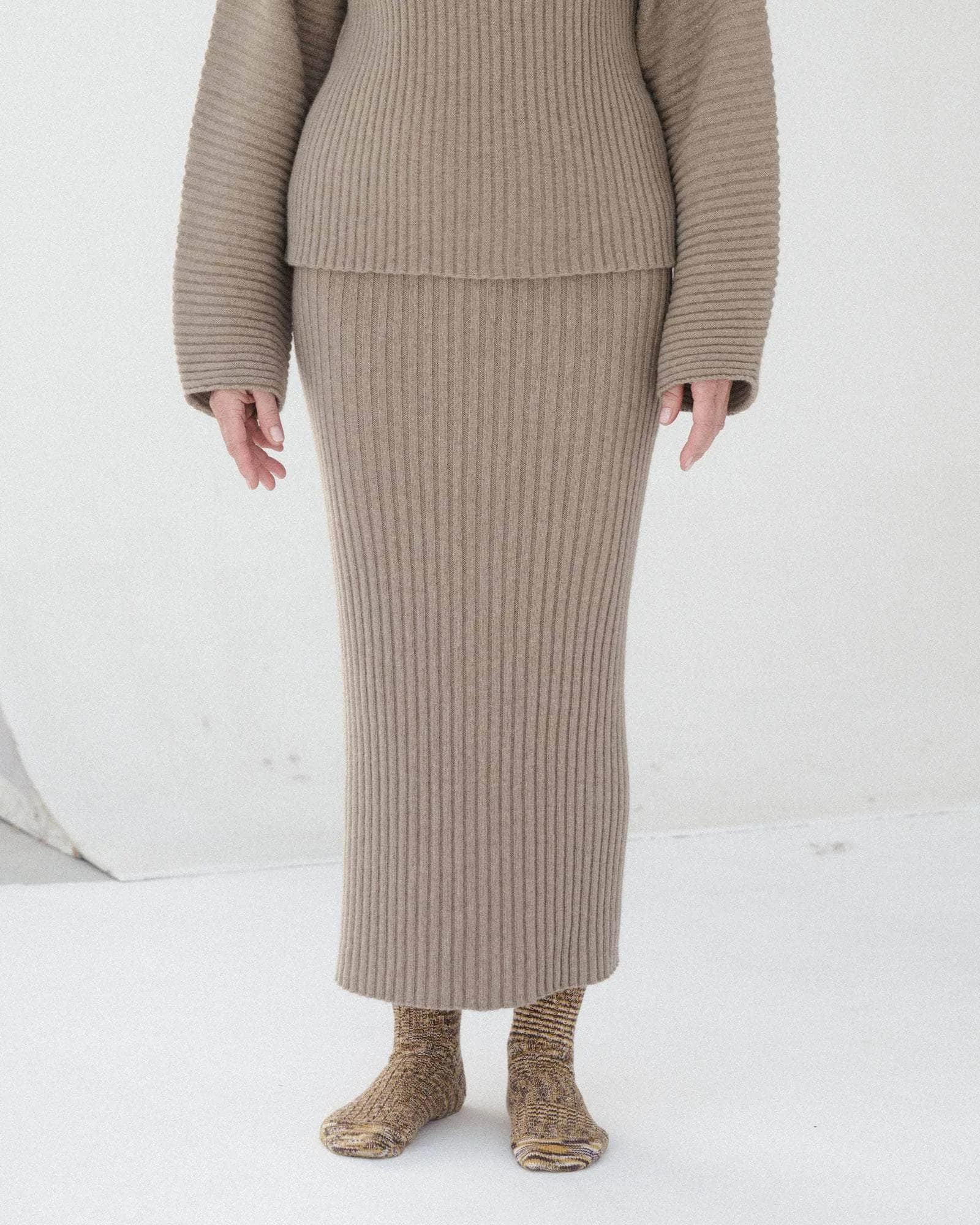 Product Details Recycled cashmere rib skirt Elastic waistband 95% Recycled Cashmere 5% Wool Made in France Model wears a size S Material Recycled Cashmere Origin: Italy Certificates: GRS, Oeko-Tex - Knitted from manually selected cashmere waste, sorted by quality, colour and fibre contents. - The waste is sourced from cashmere spinners & weavers as well as collection points for worn cashmere garments. - As the fibers are already dyed, the dyeing stage does not need to be repeated. - Sorting experts combine these scraps to reach different color combinations through the mechanical spinning process. - We use recycled cashmere as it reduces methane emissions from goats, and water pollution from washing cashmere. - Recycled cashmere uses less energy, dye, and water than virgin cashmere. It also reduces the amount of fabric going into landfill and keeps materials in circulation for longer.