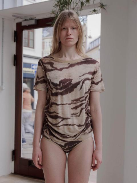 Product Details No return & exchange on sale products Bamboo lyocell tee Wide neck Drop sleeve 100% Bamboo Lyocell Made in Portugal Model wears a size S Material Lyocell Origin: China Certificates: FSC - Lyocell is a manmade fiber made of natural regenerated cellulose. - The lyocell process eliminates toxic chemicals and reactions and reduces air and water emissions. - Lyocell is made from traceable wood pulp harvested from FSC-certified farms. The farms have been established on land unsuitable for food crops or grazing. - Lyocell is made of eucalyptus or bamboo trees that don’t require irrigation or pesticides and grow fast. - Lyocell fiber production itself is more environmentally friendly than cotton due to its closed-loop process. This means that up to 99% of the water and solvents used are reused. - Manufacturing lyocell does not require bleach. - Lyocell fiber is stronger than viscose both when dry and wet. - Sea cell is a similar fiber made from seaweed and sea algae with therapeutic qualities.