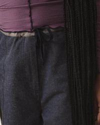 Product Details Recycled denim pants Drawstring at waist Darts at front Two back pockets Zipper closure 72% Recycled Cotton 23% Recycled Polyester 5% Others Made in Portugal Model wears a size S Material Recycled Denim Origin: Portugal Certifications: GRS, Oeko-tex - The recycled denim jersey we use comes from a recycling mill in Northern Portugal, close to our factories. - Made of used denim and jeans that are sorted based on color. The sorted denim is broken up by a machine that ensures no chemical, water or dye needs to be used. - Fabrics come in different shades of blue denim, allowing us to use an ‘undyed’ fabric with a color pigment, like our recycled wool. - Allows us to reduce our resource use from energy, chemicals, water and land use. - Recycled cotton is often paired with virgin cotton to improve the quality of the finished fabric.
