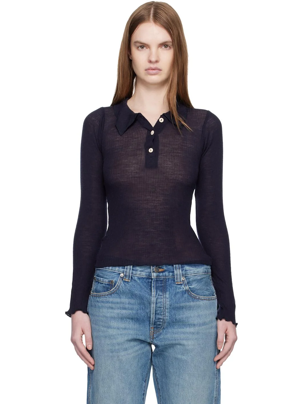 Semi-sheer rib-knit wool polo. · Certified OEKO-TEX® 100, Woolmark, and SustainaWOOL · Spread collar · Three-button placket · Lettuce edge at hem and cuffs Supplier color: Murano navy 100% wool. Made in Portugal 252922F108003