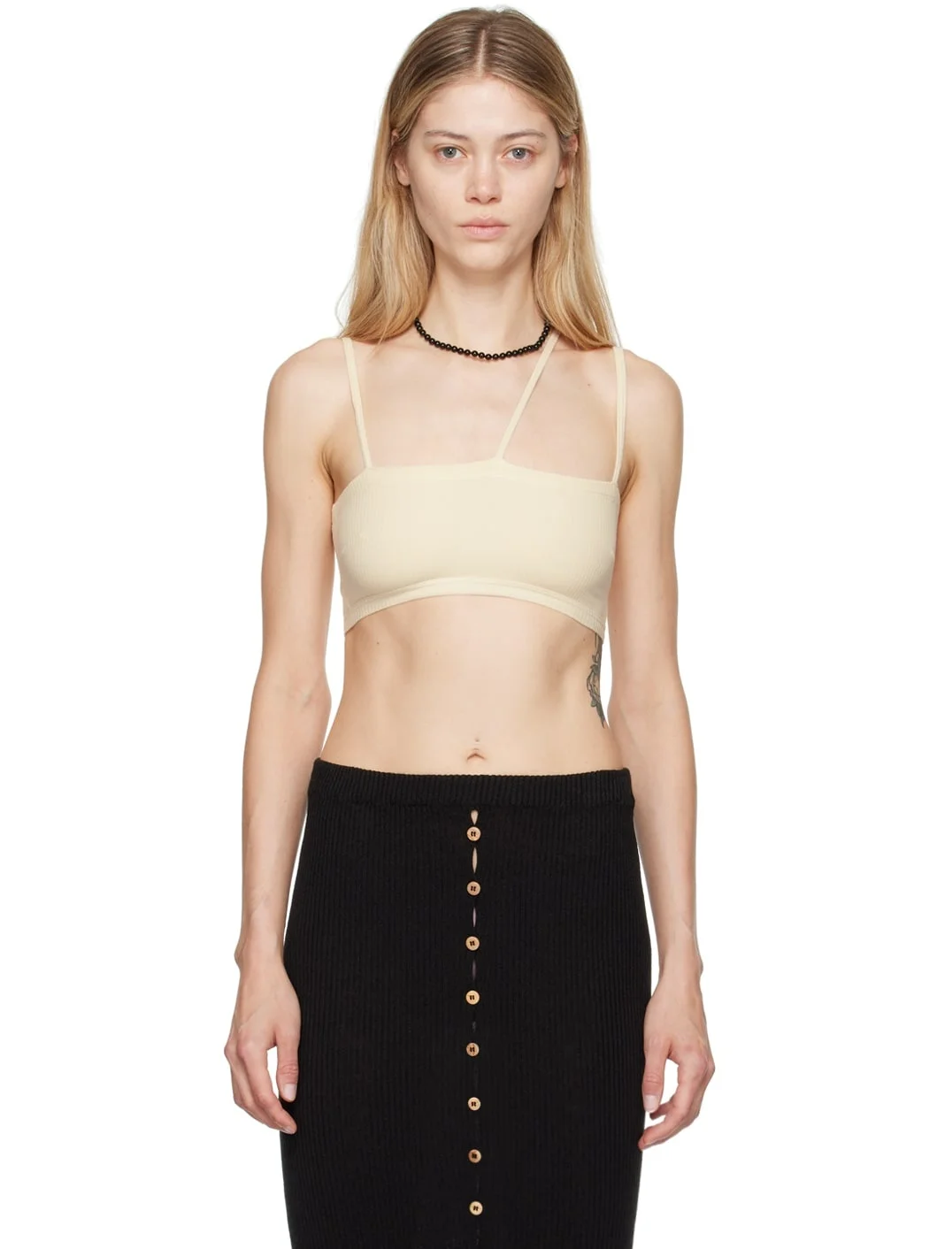 Stretch organic cotton ribbed jersey bra. GOTS-, Oeko-Tex®-, and OCS 100-certified. · Asymmetric strap at square neck · Elasticized hem · Fixed spaghetti straps · Fully lined Supplier color: Off white 91% organic cotton, 9% elastane. Made in Portugal 242922F073000