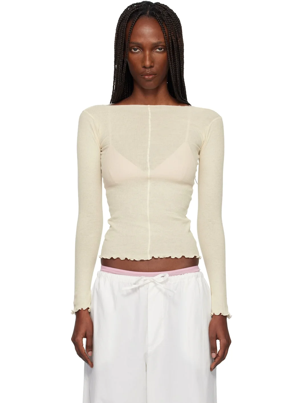 Lightweight and semi-sheer organic cotton jersey T-shirt. · Boatneck · Lettuce edge at collar, hem, and cuffs · Central seam at front and back Supplier color: Off White 100% organic cotton. Made in Portugal 261922F110006