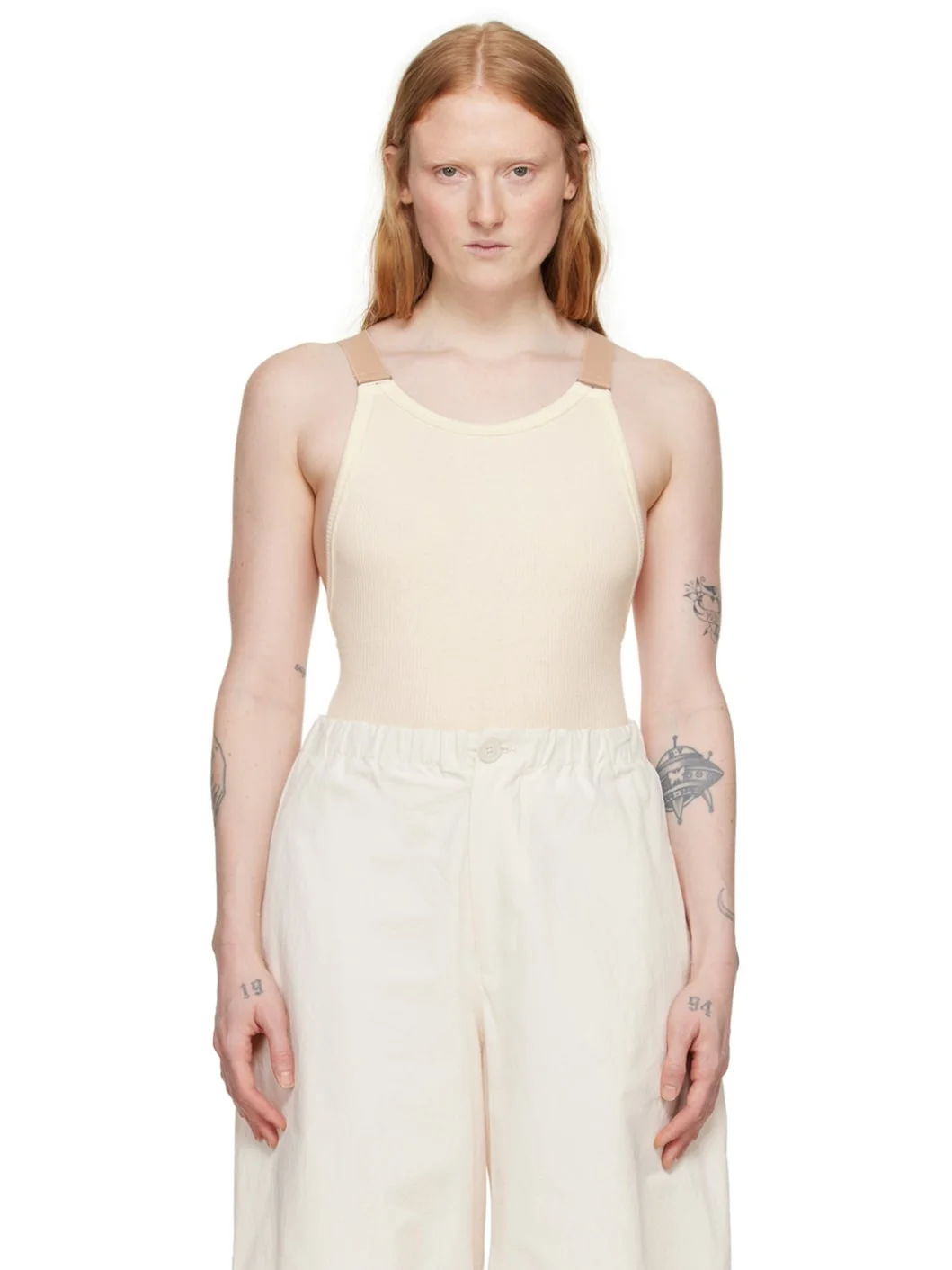 Recycled cotton-blend ribbed jersey bodysuit. · Scoop neck · Press-stud closure at bottom · Adjustable elasticized shoulder straps · Low back · Partial jersey lining Supplier color: Undyed 60% recycled cotton, 40% cotton. Made in Portugal 241922F358005