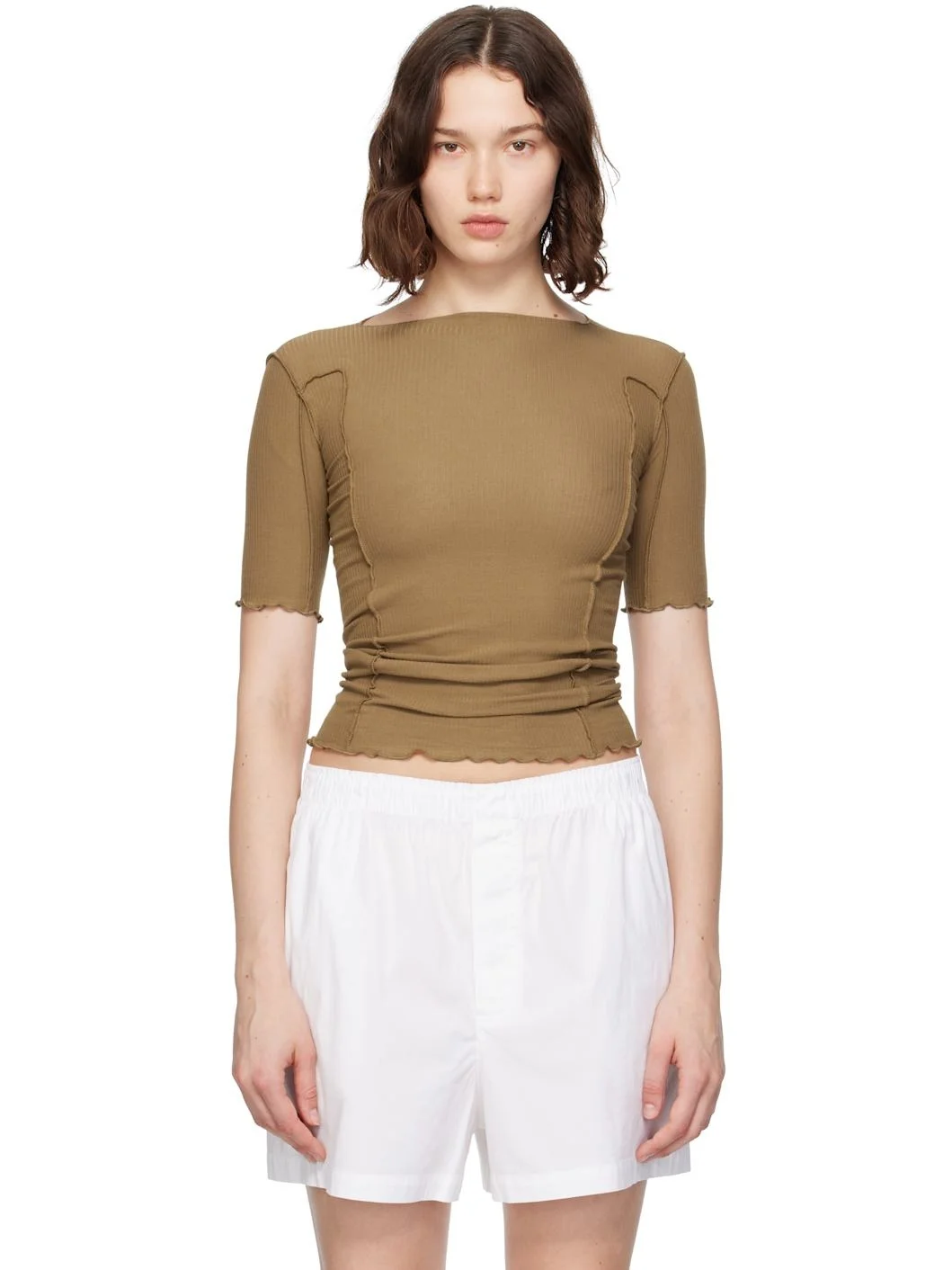 Stretch organic cotton ribbed jersey T-shirt. GOTS-, OEKO-TEX®-, and OCS 100-certified. · Exposed seams throughout · Paneled construction · Lettuce edge at boatneck, hem, and cuffs Supplier color: Alamillo brown 91% organic cotton, 9% elastane. Made in Portugal 251922F110049