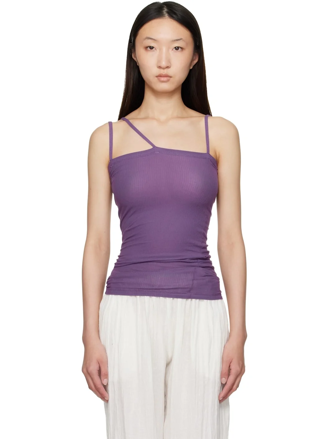 Ribbed stretch organic cotton jersey tank top. · GOTS-, OEKO-TEX®-, and OCS 100-certified · Asymmetrical strap at straight neck · Fixed spaghetti straps Supplier color: Venet purple 91% organic cotton, 9% elastane. Made in Portugal 252922F111007