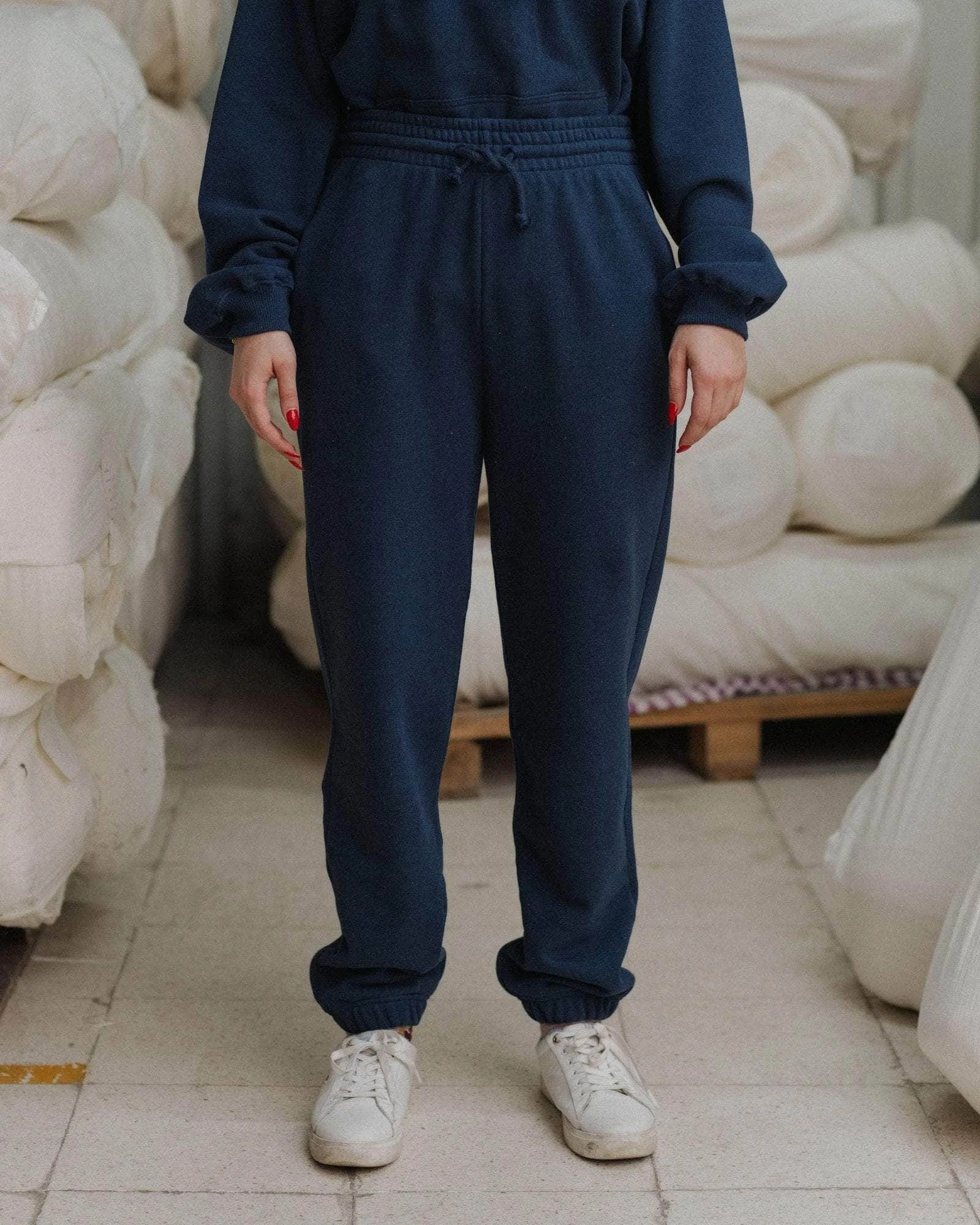 Product Details Recycled cotton fleece sweatpants Elastic waistband with drawstring 50% Recycled Cotton 50% Organic Cotton Made in Portugal Model wears a size S Material Recycled Cotton Origin: Portugal, Spain, India Certifications: GRS, Oeko-tex - Recycled cotton is made from pre-consumer textiles such as cotton scraps, factory offcuts, or deadstock from virgin cotton fabric production. - Recycled cotton is often paired with virgin cotton to improve the quality of the finished fabric, as recycled cotton often has lesser yarn strength. - Making recycled cotton uses less energy, dye, and water than virgin materials. - It also reduces the amount of fabric going into landfill and keeps materials in circulation for longer.