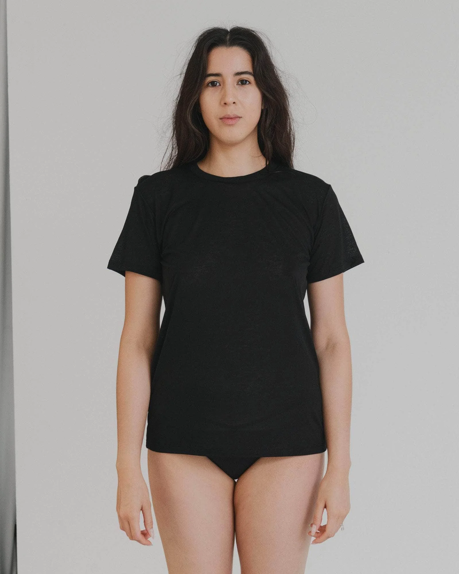 Product Details Bamboo lyocell tee Crewneck Model wears a size M 100% Bamboo Lyocell Made in Portugal Fiber origin – China Spun in Portugal Knitted in Portugal Sewn in Portugal Material Lyocell Origin: China Certificates: FSC - Lyocell is a manmade fiber made of natural regenerated cellulose. - The lyocell process eliminates toxic chemicals and reactions and reduces air and water emissions. - Lyocell is made from traceable wood pulp harvested from FSC-certified farms. The farms have been established on land unsuitable for food crops or grazing. - Lyocell is made of eucalyptus or bamboo trees that don’t require irrigation or pesticides and grow fast. - Lyocell fiber production itself is more environmentally friendly than cotton due to its closed-loop process. This means that up to 99% of the water and solvents used are reused. - Manufacturing lyocell does not require bleach. - Lyocell fiber is stronger than viscose both when dry and wet. - Sea cell is a similar fiber made from seaweed and sea algae with therapeutic qualities.