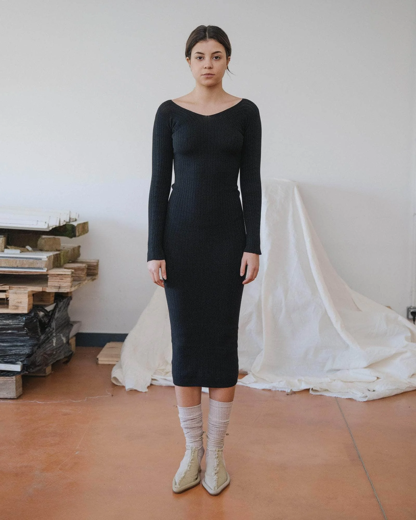 Product Details No return & exchange on sale products Organic cotton longsleeve ribbed knit dress V neck 100% Organic Cotton Made in France Model wears size S and is 171cm Material Organic cotton Origin: Brazil, India, Egypt Certificates: GOTS, Oeko-Tex, OCS 100 - Cotton is a natural seed fiber. - It is durable, breathable, absorbent, and soft. Cotton is ideal for dyeing and printing. The material is also biodegradable and hypoallergenic. - Nearly all cotton is grown in rotation, but conventional cotton generally has a higher environmental impact. - Baserange sources organic cotton, as we want to ensure that no harmful chemicals are used in the production process, water consumption is controlled, water is not contaminated and workers' rights are also preserved. - Organic agriculture uses agronomic, biological, and mechanical techniques instead of synthetic chemicals. - Organic cotton supports good soil health and ecosystems and is not harmful to human health or the environment. No pesticides or fertilizers are used. Most of the organic cotton we use is also rain-fed and doesn’t require much irrigation.
