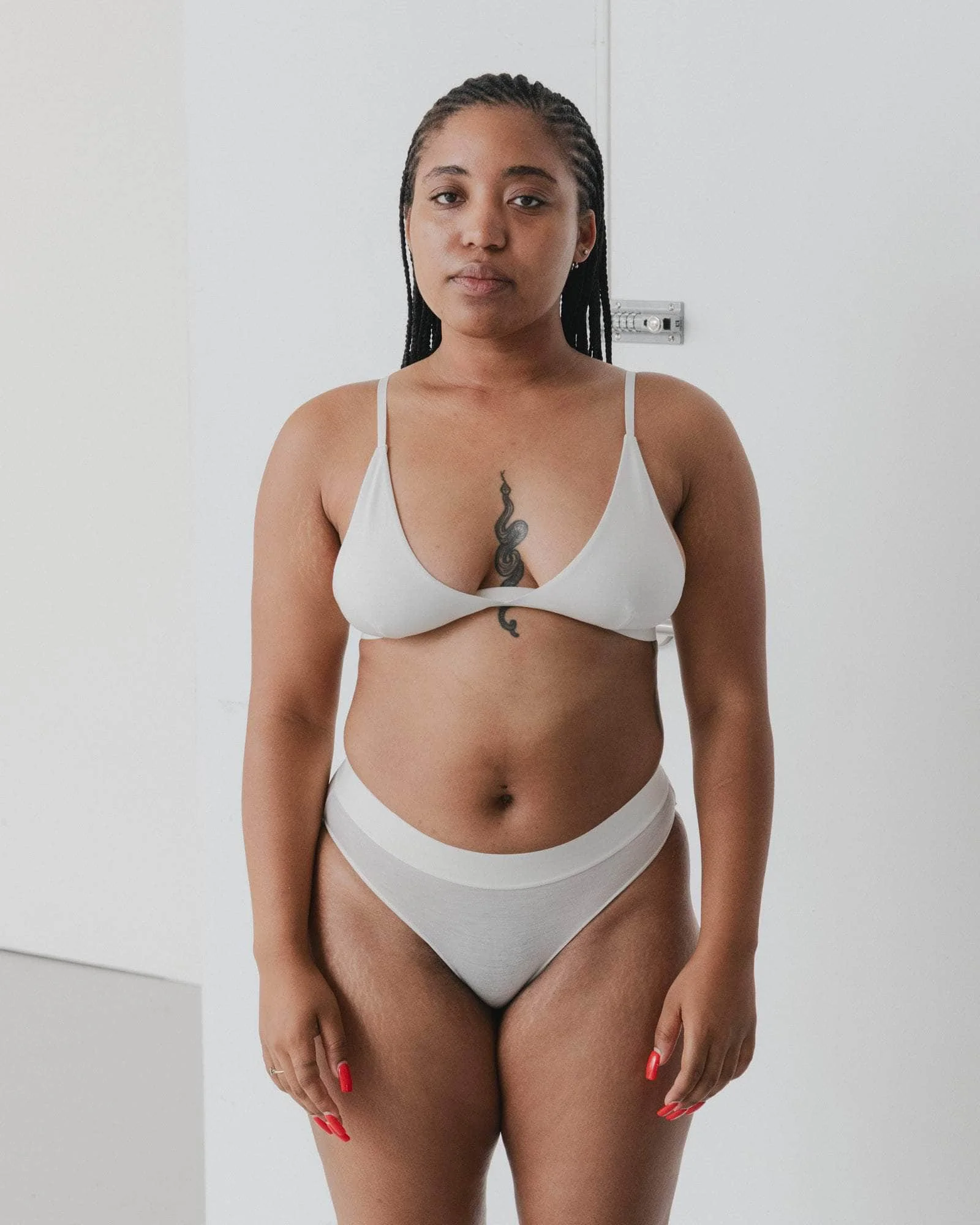 Product Details Bamboo lyocell bra Darts at chest Thick elastic trim at hem Thin adjustable straps Self lined Supportive for medium and small bust Undyed Model wears a size S 93% Bamboo Lyocell 7% Elastane Made in Portugal Fiber origin – China Spun in Portugal/Brazil Knitted in Portugal Sewn in Portugal Material Lyocell Origin: China Certificates: FSC - Lyocell is a manmade fiber made of natural regenerated cellulose. - The lyocell process eliminates toxic chemicals and reactions and reduces air and water emissions. - Lyocell is made from traceable wood pulp harvested from FSC-certified farms. The farms have been established on land unsuitable for food crops or grazing. - Lyocell is made of eucalyptus or bamboo trees that don’t require irrigation or pesticides and grow fast. - Lyocell fiber production itself is more environmentally friendly than cotton due to its closed-loop process. This means that up to 99% of the water and solvents used are reused. - Manufacturing lyocell does not require bleach. - Lyocell fiber is stronger than viscose both when dry and wet. - Sea cell is a similar fiber made from seaweed and sea algae with therapeutic qualities.