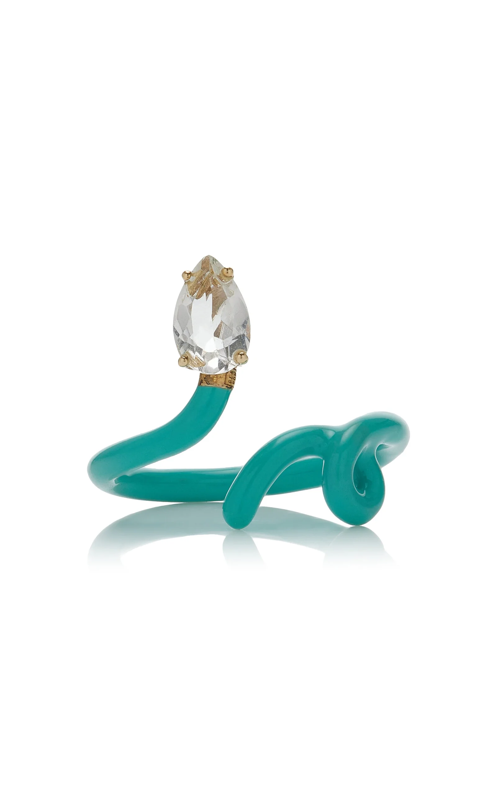 Milanese designer Bea Bongiasca's spirited and non-traditional take on fine jewelry stems from her passion for pop culture, contemporary art and design, and a deep love for everything colorful. With a focus on jewelry as an art form, each piece is handmade in Italy using 9k gold (so its price point remains accessible) fused with enamel to add kinetic movement. 9kt Yellow Gold and Silver with Hint of Mint enamel and Drop Cut Rock Crystal. PRODUCT DETAILS - Composition: 9k yellow gold, sterling silver, enamel, rock crystal - Designer color: Hint of Mint - Made in Italy - Please note the possibility of natural inclusions in gemstones SIZE & FIT - Drop Length: 0.75" - Band Width: 0.1"