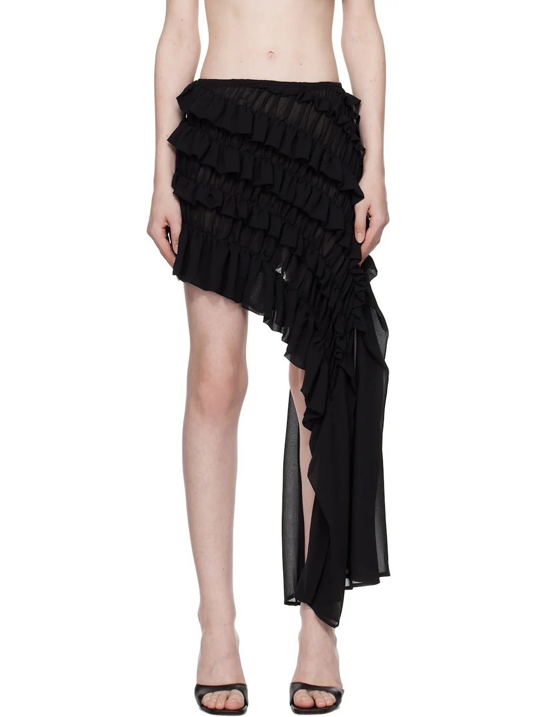 Semi-sheer polyester georgette miniskirt. Shirring and ruffled trim throughout. · Elasticized waistband · Extended trim at asymmetric hem Supplier color: Black 100% polyester. Made in Portugal 251868F090002