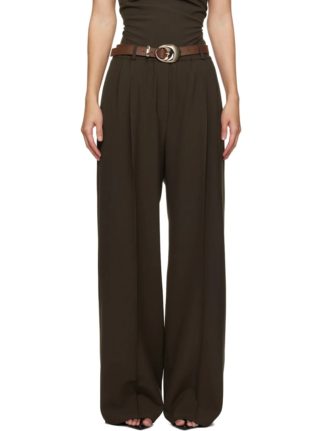 Plain-woven stretch polyester- and viscose-blend trousers. · Belt loops at elasticized waistband · Four-pocket styling · Zip-fly · Pleats at front · Creased legs Supplier color: Dark khaki 68% polyester, 29% viscose, 3% elastane. Made in Portugal 251868F087001