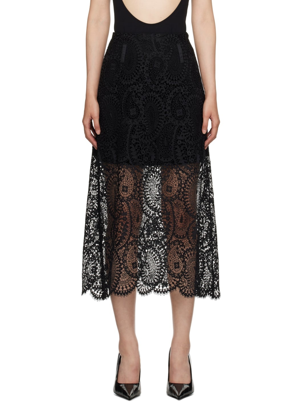Polyester lace skirt. · Belt loops · Fringed detailing and scalloped edge at hem · Zip closure at side seam · Detachable jersey underlay Supplier color: Black