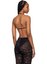 Semi-sheer stretch nylon-blend lace bra. · Adjustable elasticized halter strap · Sweetheart neck · Gathering at front · Elasticized hem Supplier color: Black 75% polyamide, 12% rayon, 13% spandex. Made in Canada 222868F073000