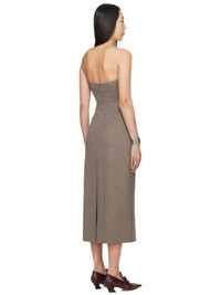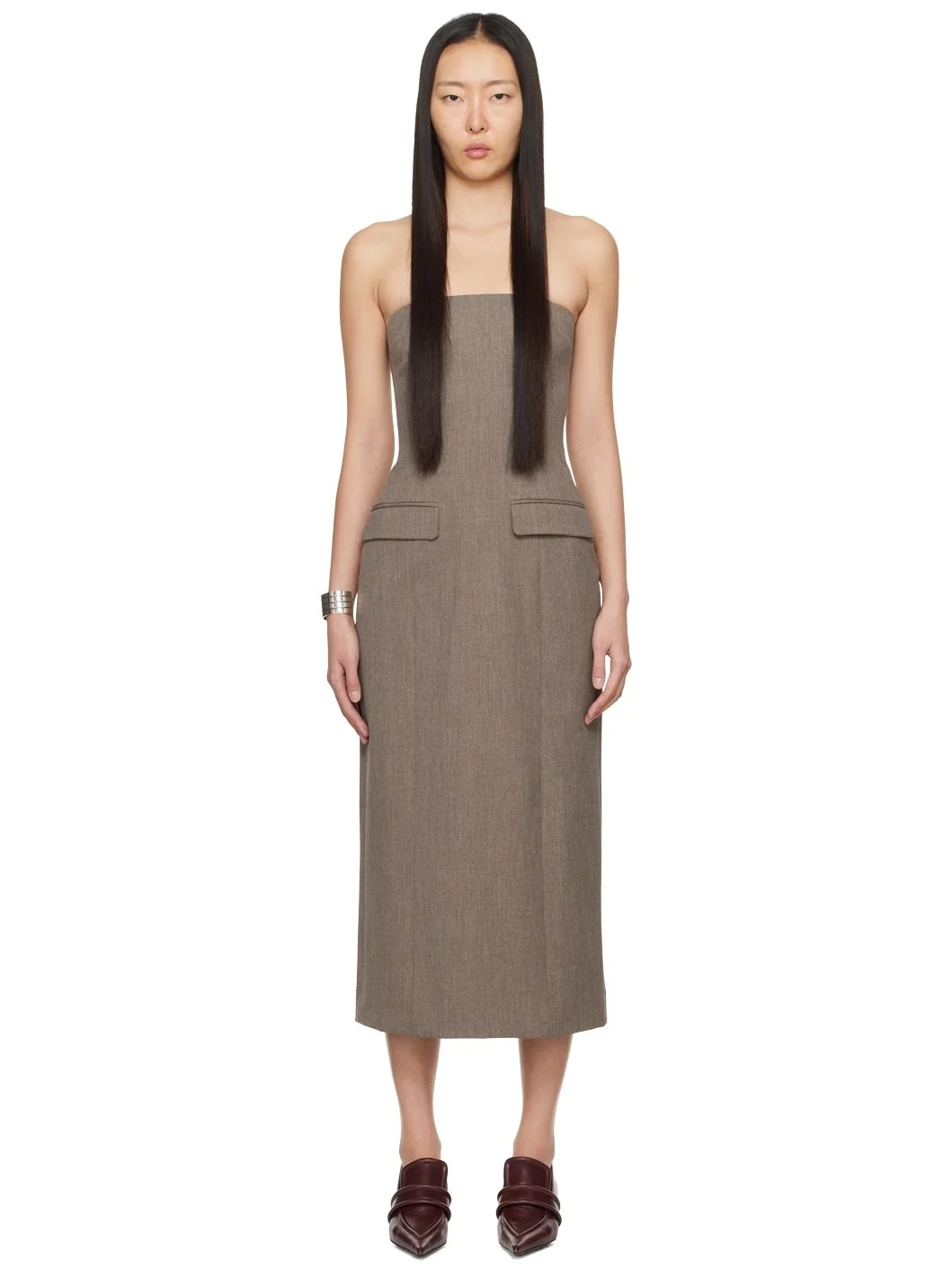 Woven stretch polyester-blend dress. · Strapless construction · Straight neck · Flap pockets · Zip closure at back · Central vent at back hem Supplier color: Heather brown 68% polyester, 29% viscose, 3% elastane. Made in Portugal 241868F055003