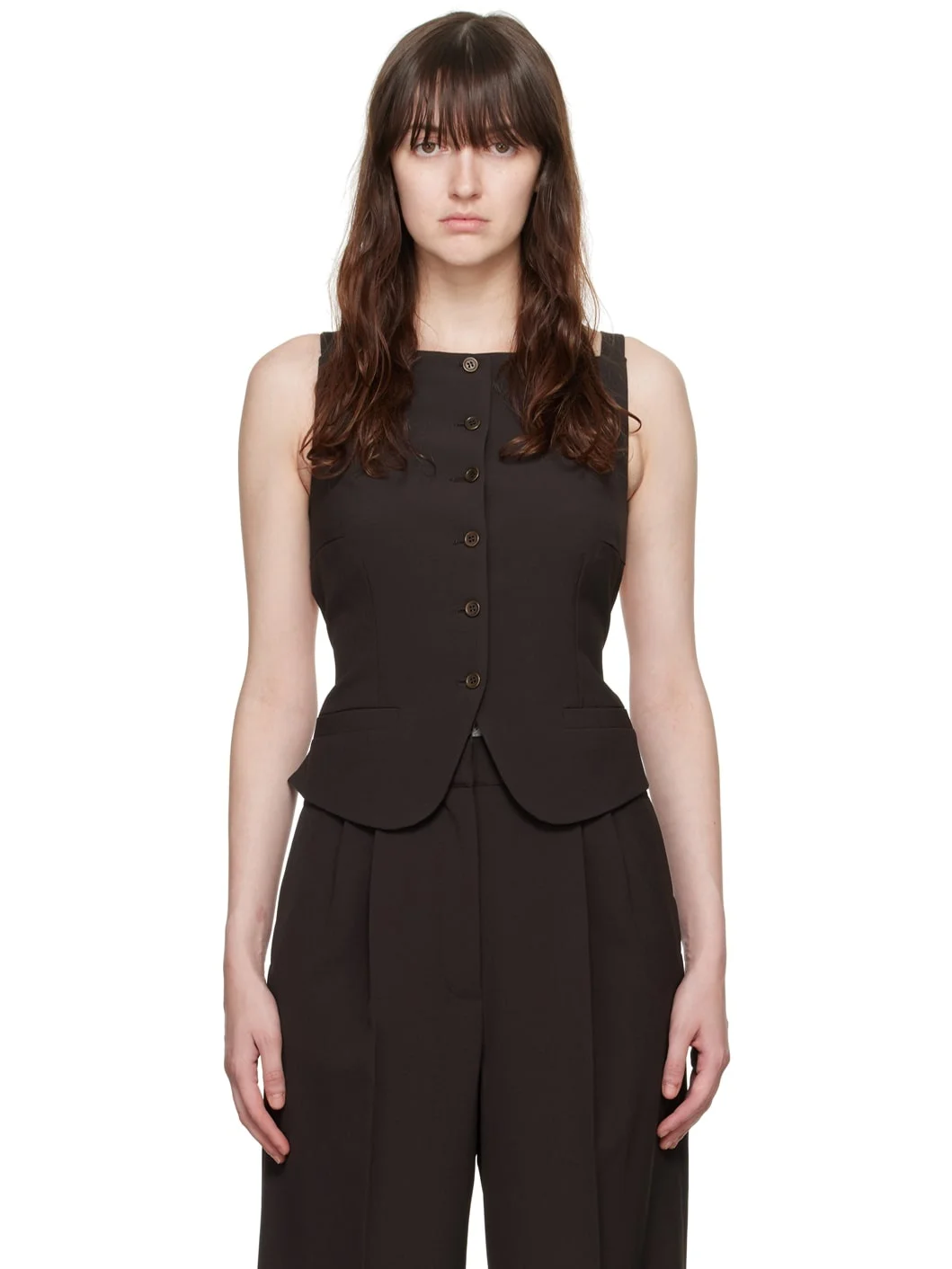 Stretch polyester- and viscose-blend barathea vest. · Boat neck · Button closure · Darts at front · Welt pockets · Cinch strap at open back · Partial cupro- and viscose-blend satin lining Supplier color: Umber Body: 68% polyester, 29% viscose, 3% elastane. Lining: 50% cupro, 50% viscose. Made in Portugal 242868F111001