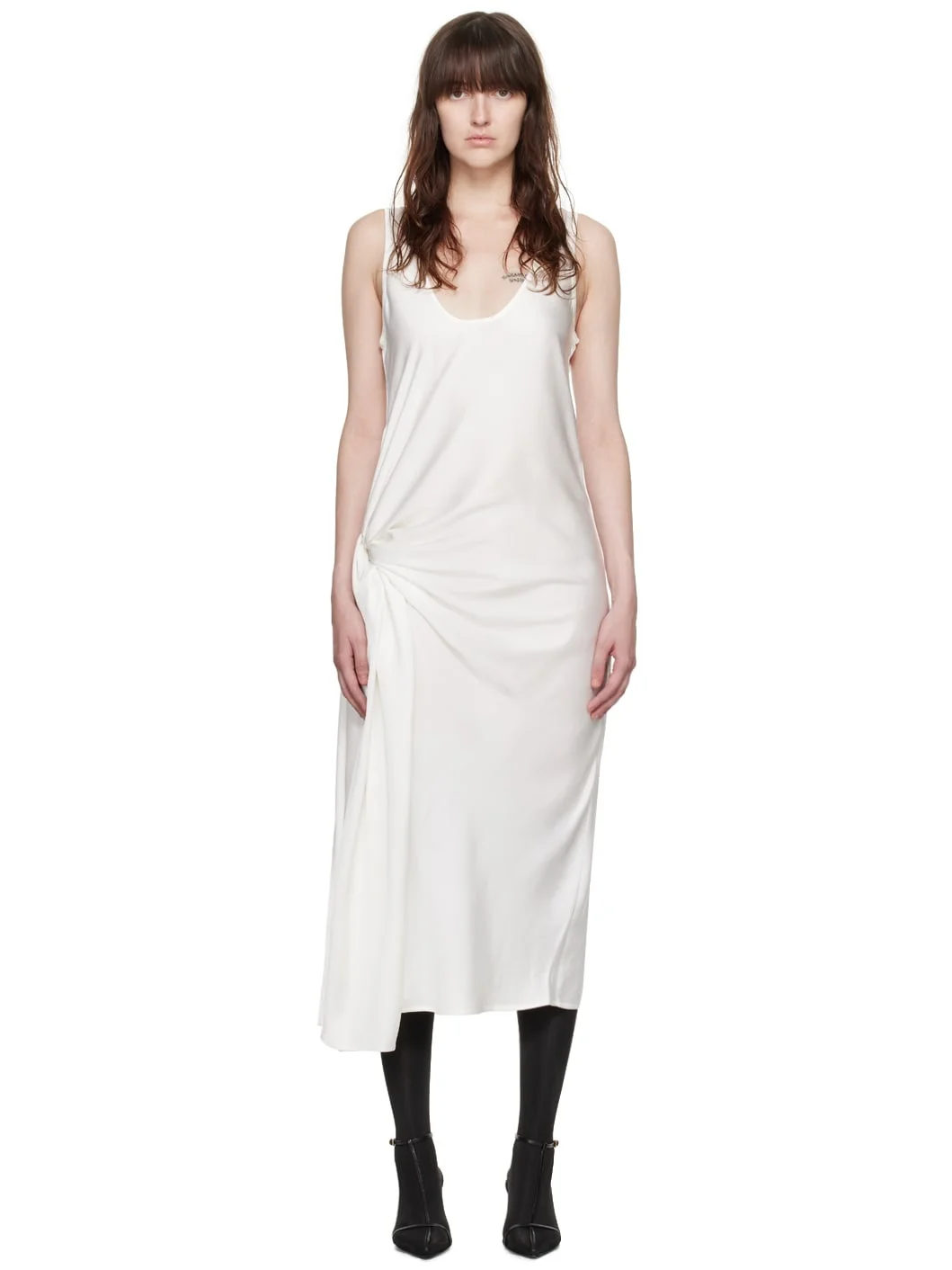 Viscose satin dress. · Scoop neck · Gathered self-tie fastening at side seam · Slit at asymmetric hem · Darts at low back Supplier color: Pearl 100% viscose. Made in Portugal 242868F055000