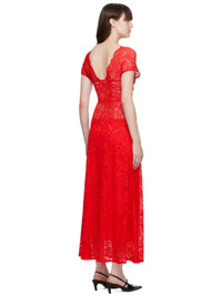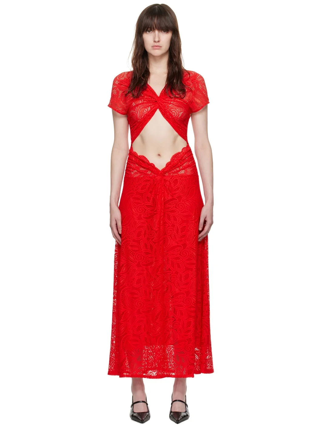 Semi-sheer stretch nylon-blend lace dress. Gathering, floral pattern, and scalloped edges throughout. · Twisted detailing at V-neck · Cutout at waist · Vent at front hem · Elasticized cuffs · Partial stretch nylon voile lining Supplier color: Red Body: 90% polyamide, 8% spandex, 2% rayon. Lining: 90% polyamide, 10% elastane. Made in Portugal 242868F055001