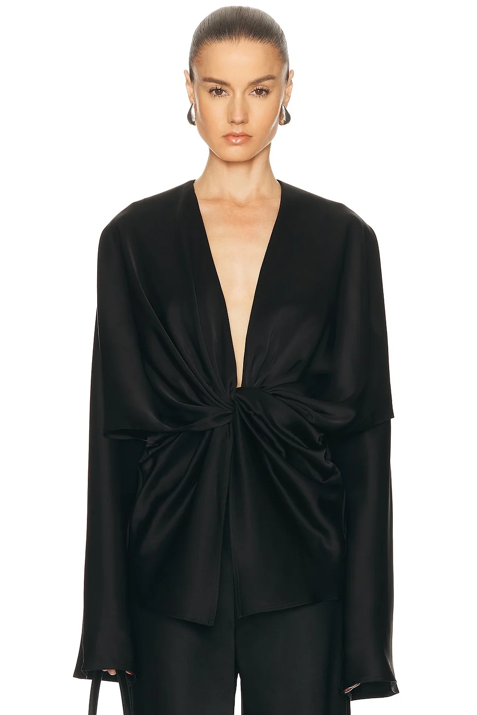 Details - 87% triacetate, 13% polyester - Made in Portugal - Dry clean - Pull-on styling with hidden back zipper closure - Twist-front design - Lightweight satin textile - Wide-sleeves - Our Style No. BAFE-WS28 - Manufacturer Style No. BFRS26B01