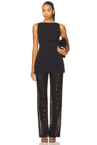 - 100% viscose - Dry clean only - Hidden back zip closure - Allover sequin detailing - Lightweight chiffon fabric - Garment is intentionally sheer, undergarments will show through - Please note undergarment not included.18" at the leg opening - Revolve Style No. BECA-WP33 - Manufacturer Style No. S25-40736