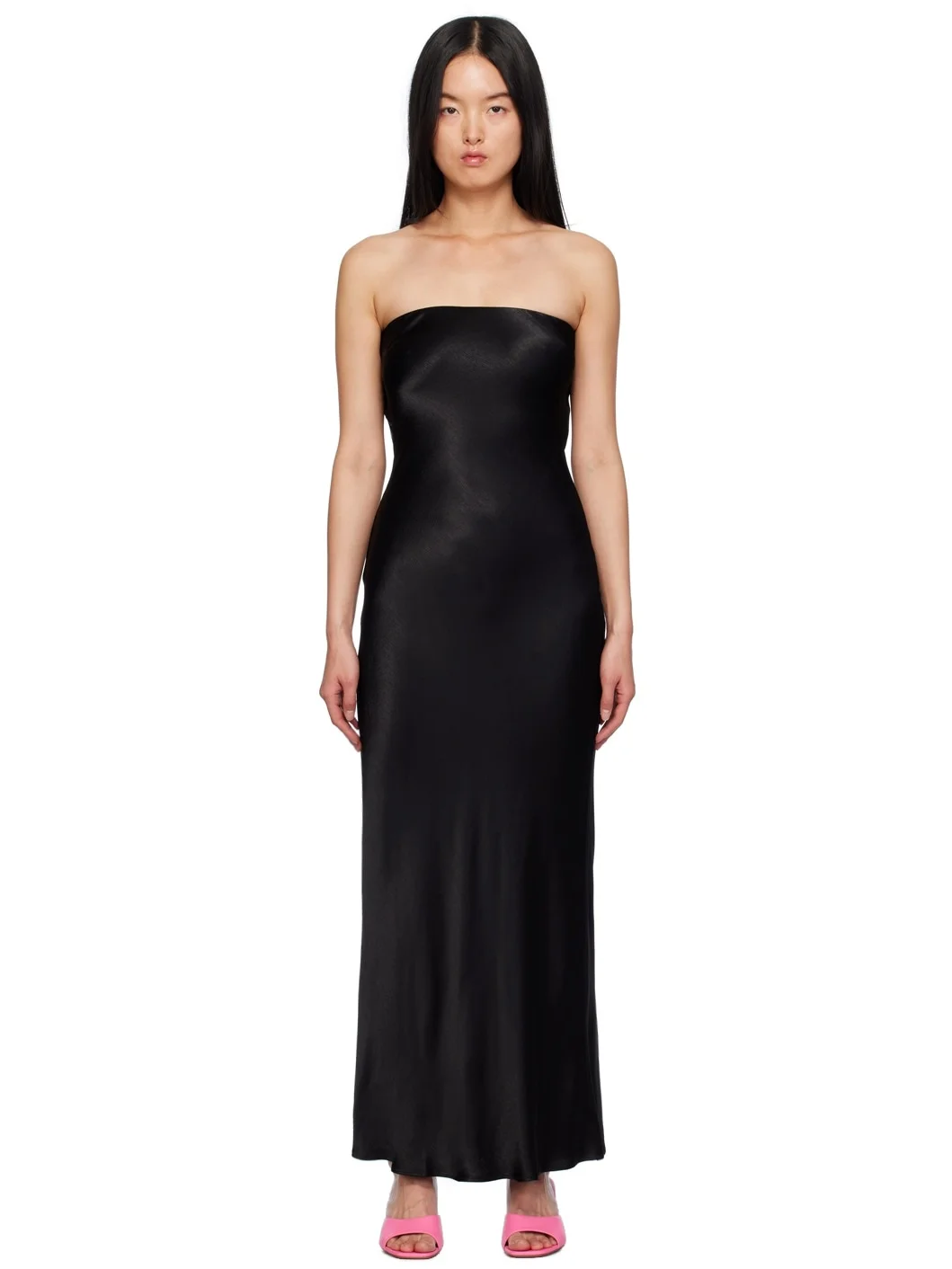 Bias-cut viscose hammered satin dress. · Strapless construction · Elasticized straight neck · Darts at chest · Hook-eye strap at low back · Draping at back · Unlined Supplier color: Black 100% viscose. Made in Australia 241880F055028