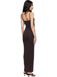 Stretch polyester jersey maxi dress. Gathering throughout. · Square neck · Draping at front · Ruching at front and side seams · Slit at front hem · Raw edge at hem · Adjustable spaghetti straps · Fully lined Supplier color: Dark chocolate Body: 87% polyester, 13% elastane. Lining: 95% polyester, 5% elastane. Made in Australia 251880F055044