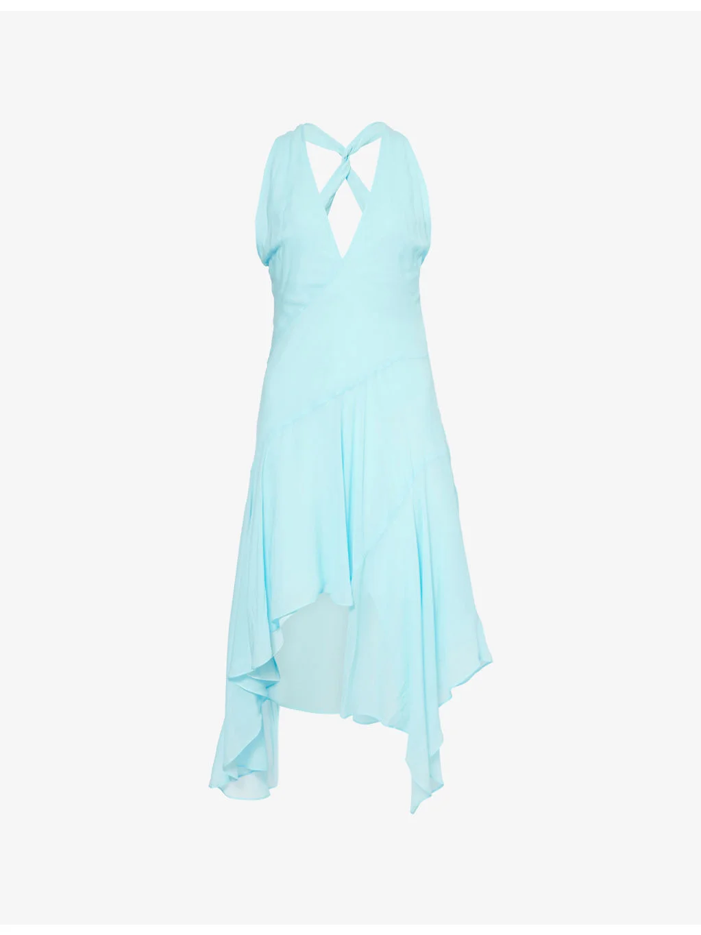 PRODUCT DETAILS - Bec + Bridge woven midi dress - 100% viscose - Slim fit, plunge V-neckline, sleeveless, twist-strap at back, asymmetric hem - Dry clean only - True to size - Size UK 8: length 45in / 114cm - Model is 5ft 10in/1.78m and wears a size UK 8 - Lightweight, non-stretch Ref: R04512716