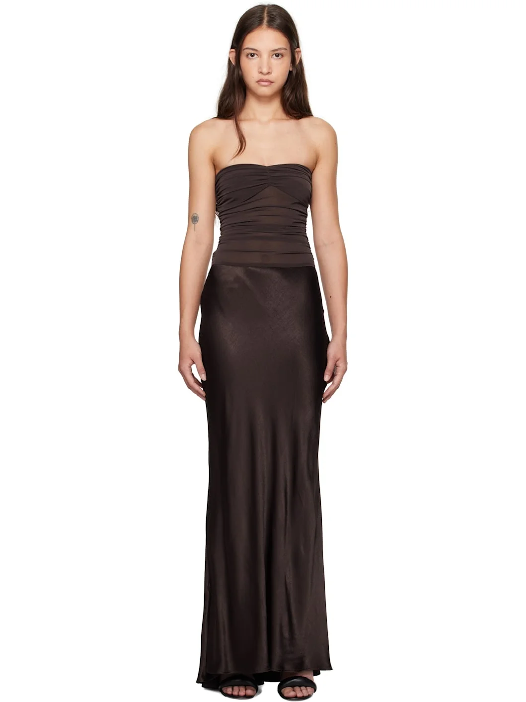 Semi-sheer bias-cut viscose satin and stretch polyester mesh maxi dress. · Paneled construction · Straight neck · Ruching at chest and side seams · Concealed zip closure at side seam · Partially lined Supplier color: Dark chocolate Body: 100% viscose. Trim: 76% recycled polyester, 24% elastane. Made in Australia 251880F055002