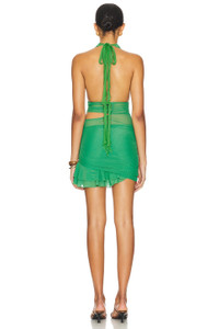 - Self: 95% nylon 5% elastane Contrast: 100% viscose Lining: 95% nylon 5% elastane - Made in China - Dry clean only - Partially lined - Pull-on styling with adjustable halterneck tie - Chiffon fabric with ruched sides - Revolve Style No. BECA-WD637 - Manufacturer Style No. W24-12260