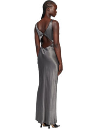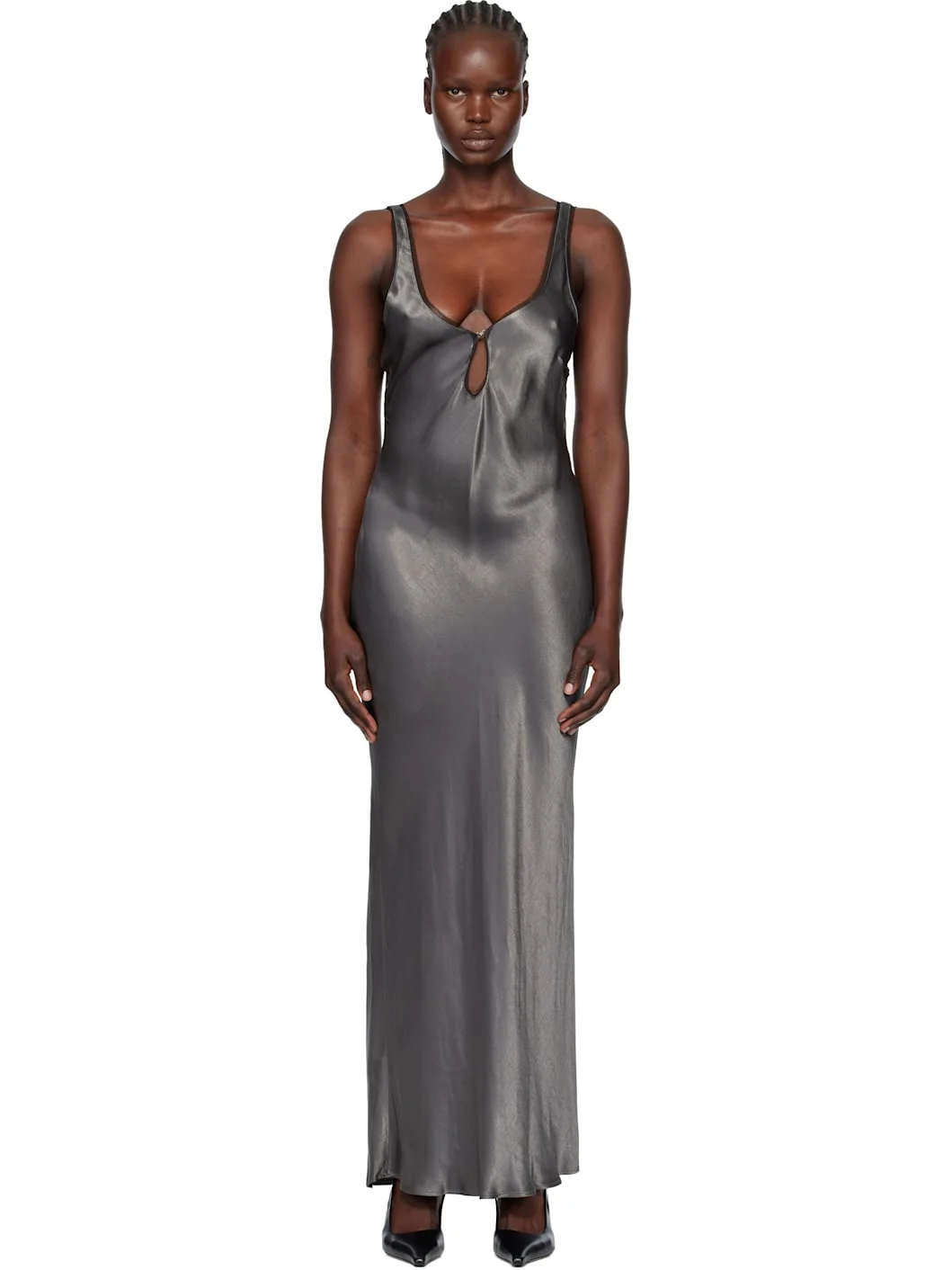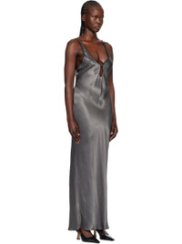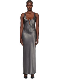 Viscose satin maxi dress. · Mesh trim throughout · Hook-eye keyhole at plunging V-neck · Hook-eye closure at low back Supplier color: Gun metal Body: 100% viscose. Trim: 80% polyester, 20% elastane. Made in Australia 241880F055033