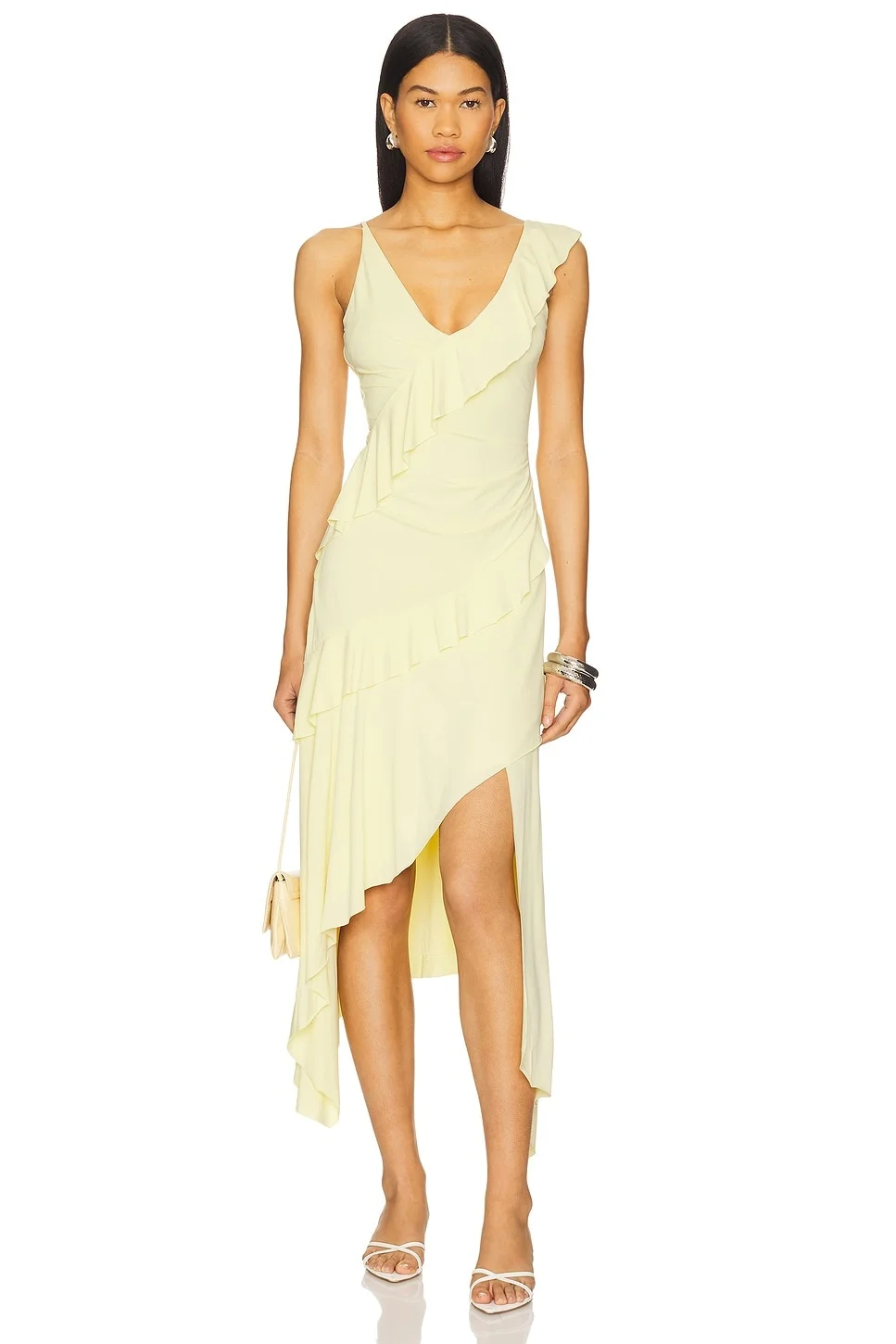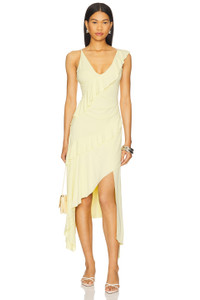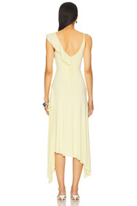 - Self: 93% viscose 7% elastane Lining: 95% polyester 5% elastane - Machine wash - Fully lined - Pull-on styling - Tiered ruffle detailing - Asymmetrical hem - Midweight jersey fabric - Revolve Style No. BECA-WD704 - Manufacturer Style No. A25-12647