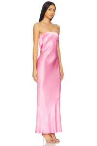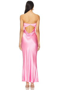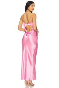 - 100% viscose - Made in Australia - Dry clean only - Unlined - Pull-on styling with back S-hook closure - Back cut-out with draped fabric detail - Satin fabric with subtly flounced hem - Neckline to hem measures approx 53" in length - Revolve Style No. BECA-WD696 - Manufacturer Style No. 10510