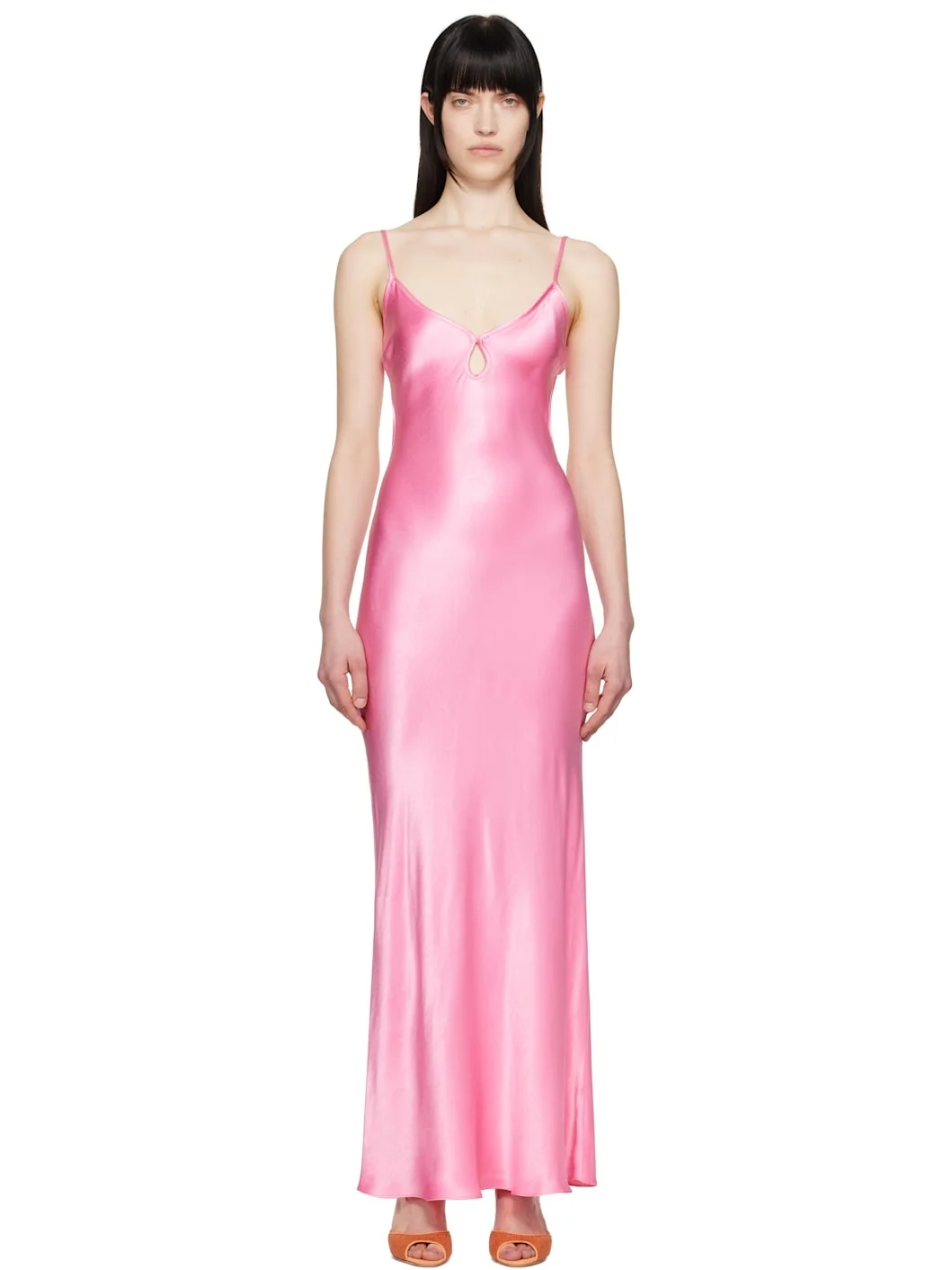 Bias-cut viscose satin maxi dress. · Plunging V-neck · Keyhole at chest · Adjustable self-tie spaghetti straps · Open back · Unlined Supplier color: Candy pink 100% viscose. Made in Australia 251880F055039