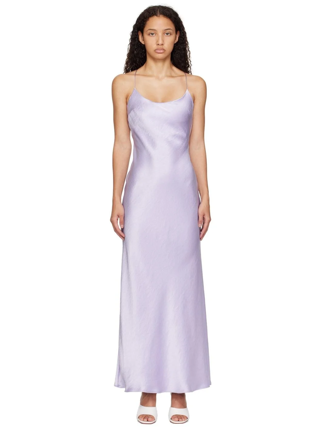 Polyester satin maxi dress. · Scoop neck · Darts at chest · Fixed spaghetti straps · Self-tie fastening at open back · Concealed zip closure at back Supplier color: Lilac 100% polyester. Made in Australia 242880F055037