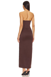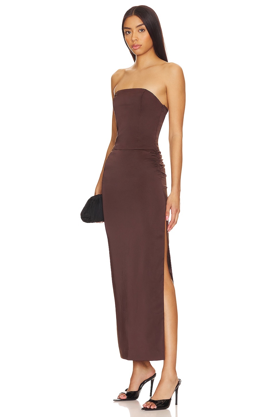 - 69% polyester 31% recycled polyester - Made in Australia - Hand wash - Partially lined - Hidden side zipper closure - Boned bodice - Satin fabric with side seam slit - Neckline to hem measures approx 52" in length - Revolve Style No. BECA-WD581 - Manufacturer Style No. H23-11985