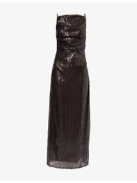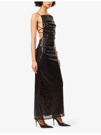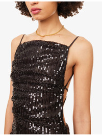 PRODUCT DETAILS - Bec + Bridge woven maxi dress - 100% polyester; lining 100% polyester - Concealed zip fastening and lace-up fastening at back - Slim fit, straight-across neckline, adjustable shoulder straps, side boning, draped, open at back, all-over sequin embellishment, all-over mesh texture, fully lined, split at back - Hand wash cold - Made in Australia - True to size - Size UK 8: length 56in / 143cm - Model is 5ft 10in/1.78m and wears a size UK 8 - Lightweight, stretchy Ref: R04552301