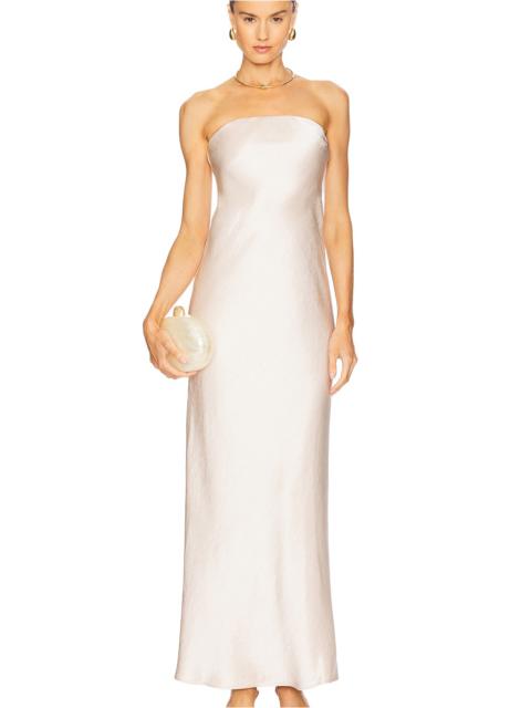 - 100% viscose - Dry clean only - Partially lined at bust - Hidden side seam zipper closure - Partial off-shoulder styling - Midweight textured high-shine charmeuse fabric with side hem slit - Revolve Style No. BECA-WD721 - Manufacturer Style No. BM- 12720