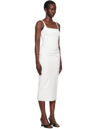 Lightweight stretch viscose-blend twill midi dress. · Square neck · Darts at front · Gathering at side seam · Raw edge hem · Low back · Fully lined Supplier color: White Body: 58% viscose, 38% nylon, 4% elastane. Lining: 95% polyester, 5% elastane. Made in Australia 251880F054000