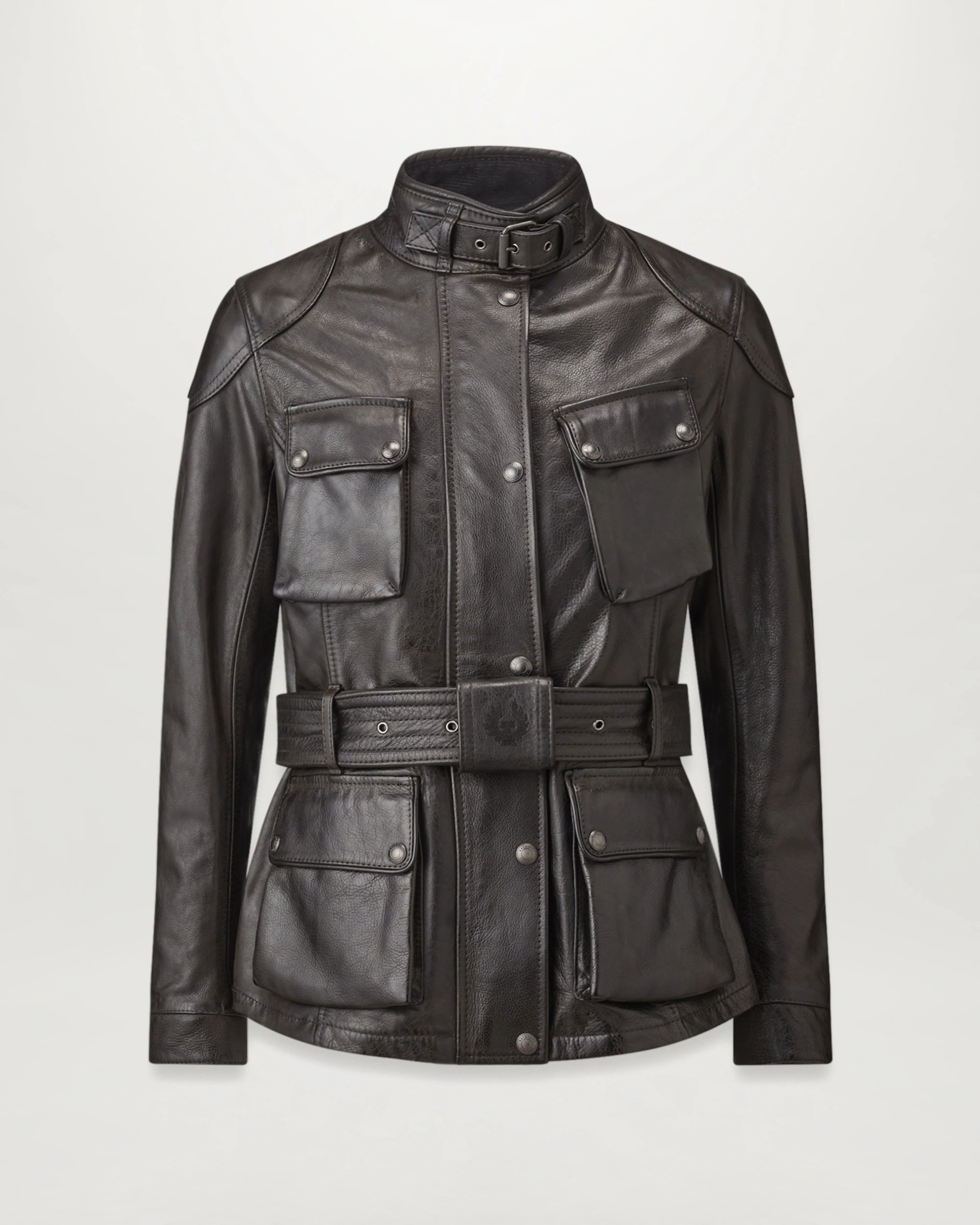 Crafted from 100 per cent cow leather, an 18-hour hand-waxing process provides the colour and ensures each jacket has a unique patina and add to the oil resistant corduroy neck and cuff facings plus protective reinforcement beneath elbow and shoulder patches. Twin needle stitching ensure durability, and D3O shoulder and elbow armour offer protection. With swivel sleeves and underarm air vents for unrivalled mobility and comfort, the timeless Trialmaster styling is completed in Antique Black with a Belstaff checked woven cotton lining. DETAILS - Hand-waxed leather - 4-pocket, longer belted style - 18 hours of hand waxing to provide the colour - Unique patina to each jacket - Protective reinforcement beneath elbow and shoulder patches - Belstaff checked woven cotton lining - Oil resistant corduroy neck and cuff facings - Knurled throat latch fastening buckle and strap - Swivel sleeve for 360Ë motion and comfort - Under-arm metal airvents - Twin needle top stitching for strength - Internal zip pocket for valuables - Engraved stud and buckle fastenings - Buckle cover with embroidered logo - Back protection pocket - Metal patch logo on left arm - 100% cow leather - Certification: A - Protection: D3O Tri-ventilation level 1 (Elbow/Shoulder) - Product ref: 105378ATBLK SIZE AND FIT - Cut for a regular fit - Model wears a size US 6 - Model measures: Height: 5'9, Chest: 31", Waist: 22"