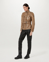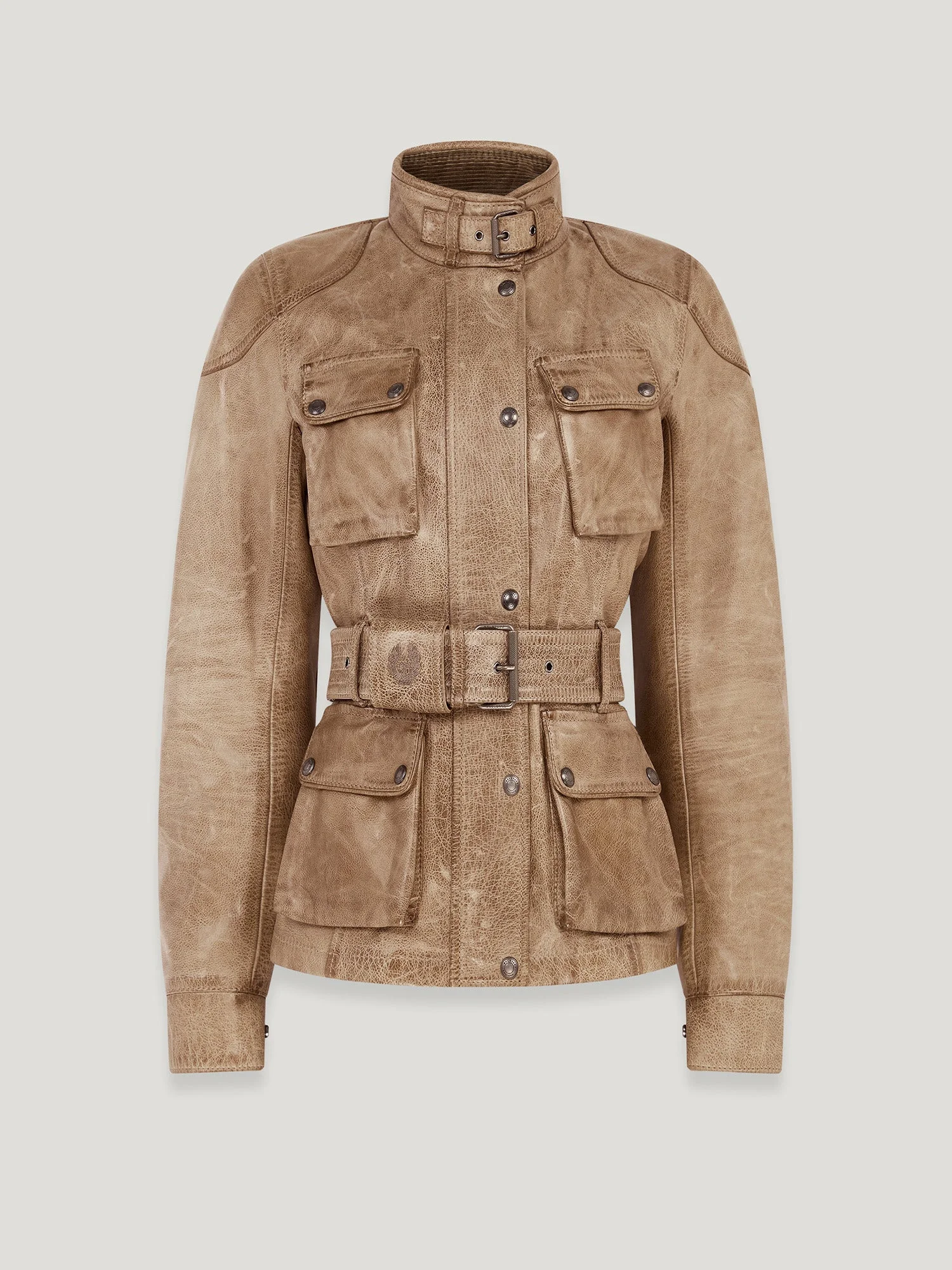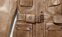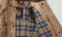 Crafted from 100 per cent cow leather, an 18-hour hand-waxing process provides the colour and ensures each jacket has a unique patina. Additional protection is provided by the oil resistant corduroy neck and cuff facings plus protective reinforcement beneath elbow and shoulder patches. Twin needle stitching ensure durability, and D3O shoulder and elbow armour offer protection. With swivel sleeves and underarm air vents for unrivalled mobility and comfort, the timeless Trialmaster styling is completed in Birch with Belstaff checked woven cotton lining. DETAILS - Hand waxed leather four pocket, longer, belted style - 18 hours of hand waxing to provide the colour - Unique patina to each jacket - Protective reinforcement beneath elbow and shoulder patches - Belstaff checked woven cotton liningA - Oil resistant corduroy neck and cuff facingsA - Knurled throat latch fastening buckle and strapA - Swivel sleeve for 360E motion and comfortA - Under-arm metal airventsA - Twin needle top stitching for strengthA - 15cm inside zip pocket for valuablesA - Engraved stud and buckle fastenings - Buckle cover with embroidered logoA - Back protection pocket - Metal patch logo on left arm - 100% Cow leather - Certification: A - Protection: D3O Tri-ventilation level 1 (Elbow/Shoulder) - Product ref: 105378BIRCH SIZE AND FIT - Cut for a regular fit - Model wears a size US 6 - Model measures: Height: 5a10a, Chest: 32a, Waist: 24a