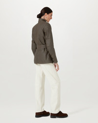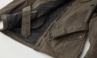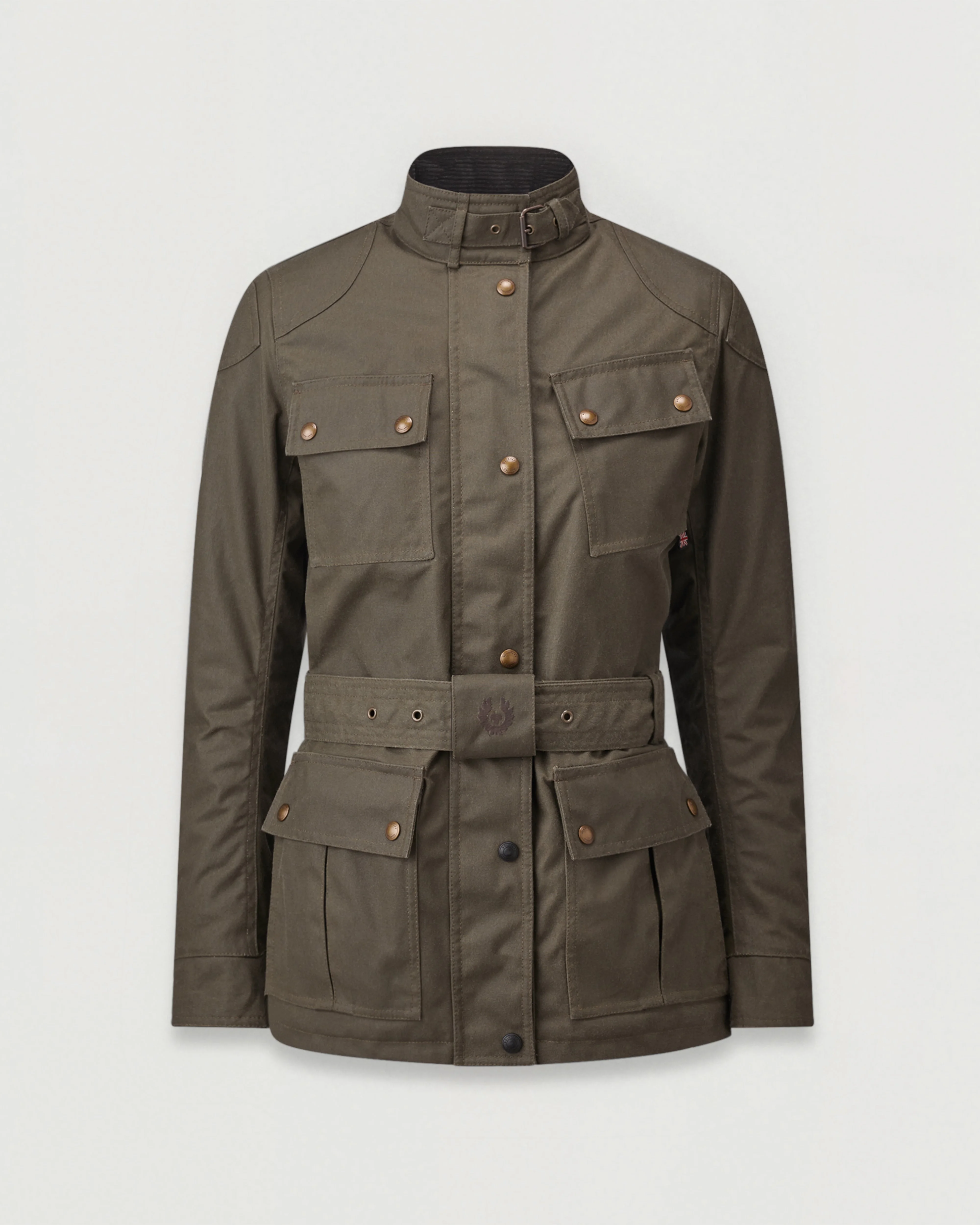With its roots in the Scottish Six Days Trial traceable back to 1948, the Trialmaster combines classic Belstaff design with advanced British Millerain 8oz, technical waxed cotton in Forest Green and interlayered waterproof membrane. Hip length for optimal protection from the elements, oil resistant corduroy collar and cuff facings, and twin needle stitching guarantee durability. Shaped panel seaming and waist adjustment buckles deliver a slim fit, while D3O shoulder and elbow armour offer protection, whilst a practical large zipped internal pocket can be found within the classic woven check lining. DETAILS - 8oz. British Millerain technical waxed cotton - Buckle cover with embroidered logo - Breathable, waterproof membrane - Shaped panel seaming for a slim fit - Hip length - Silicone coated snap fastenings - Oil-resistant corduroy collar and cuffs - Zipped internal pocket - Knurled buckle and strap fastening throat latch - Zipped back protection pocket - Twin needle topstitching for strength - Adjustable buckled waist - Engraved antique brass fastenings - Adjustable cuffs with gusset - Belstaff logo patch on left arm - 65% polyester, 35% cotton - Certification: AA - Protection: D3O Tri-ventilation level 1 (Elbow/Shoulder) - Product ref: 104973FRSGR SIZE AND FIT - Cut for a regular fit - Model wears a size US 6 - Model measures: Height: 5'9", Chest: 31", Waist 22"