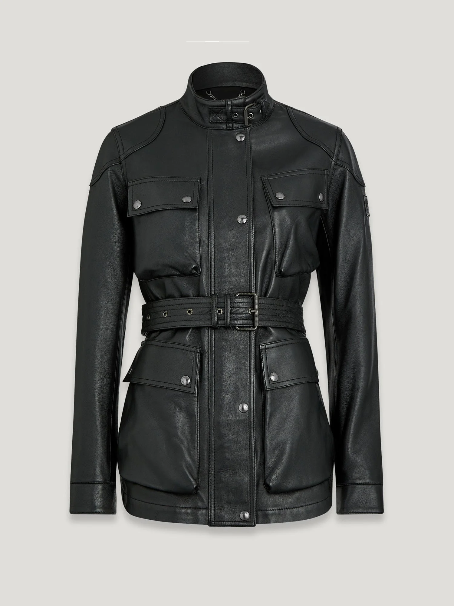 The women’s Trialmaster Panther. A smooth leather field jacket that can be cinched at the waist to customise the fit, this practical four-pocket design is part of our core Icon collection. DETAILS - Nappa leather - Classic Belstaff shape - Waist belt - Shoulder and elbow panels - Metal plaque on leather base on left sleeve - Centre front zip and snap placket - Buckle-adjusted collar - 4 bellows pockets with dual press stud closure - Signature tilted left breast pocket - Shell: 100% Lamb leather - Lining: 62% Acetate, 38% Polybutylene terepthalate - Belstaff`s leather products support responsible manufacturing via the Leather Working Group - Product ref: 100009BLACK SIZE AND FIT - Cut for a regular fit - Model wears a size 40 - Model measures: Height: 5’8”, Chest: 34”, Waist: 25”