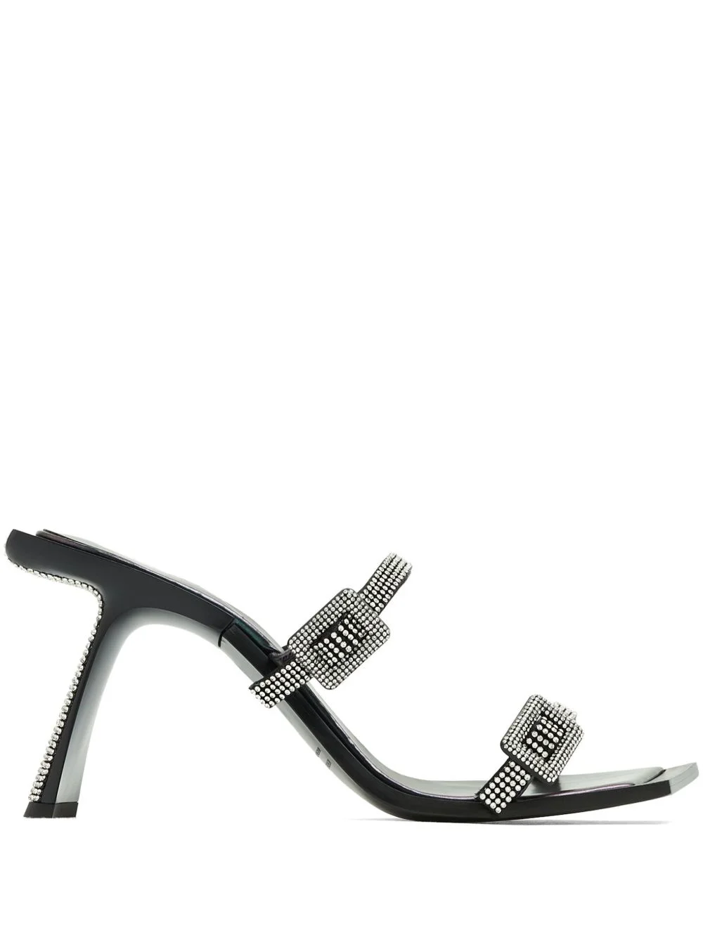80mm Ewa sandals Highlights - Black - Calf leather - Satin weave - Crystal embellishment - Double-strap design - Square open toe - Slip-on style - Branded insole - Sculpted heel Made in Italy Composition Outer: glass 100% Lining: Calf Leather 100% Sole: Calf Leather 100% SIZE & FIT Measurement HEEL 3.14 in(8 cm)