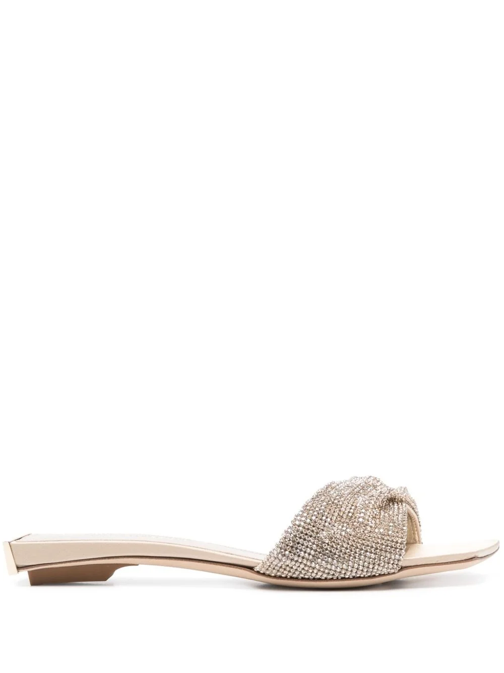 Goliarda slides Highlights - Gold-tone - Flat leather sole - Branded footbed - Crossover strap detail - Square open toe Made in Italy Composition Lining: Fabric 100%, Calf Leather 100% Outer: Crystal 100% Sole: Calf Leather 100%