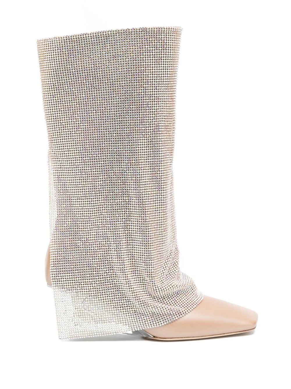 Virginia 95mm crystal-drape boots golden honey beige calf leather crystal embellishment draped detailing 95mm heel branded leather insole square toe knee-length Made in Italy Composition Sole: Rubber 100%, Calf Leather 100% Lining: Calf Leather 100% Outer: Calf Leather 100% SIZE & FIT Measurement CIRCUMFERENCE 14.96 in(38 cm) HEEL 2.75 in(7 cm) HEIGHT 11.02 in(28 cm)