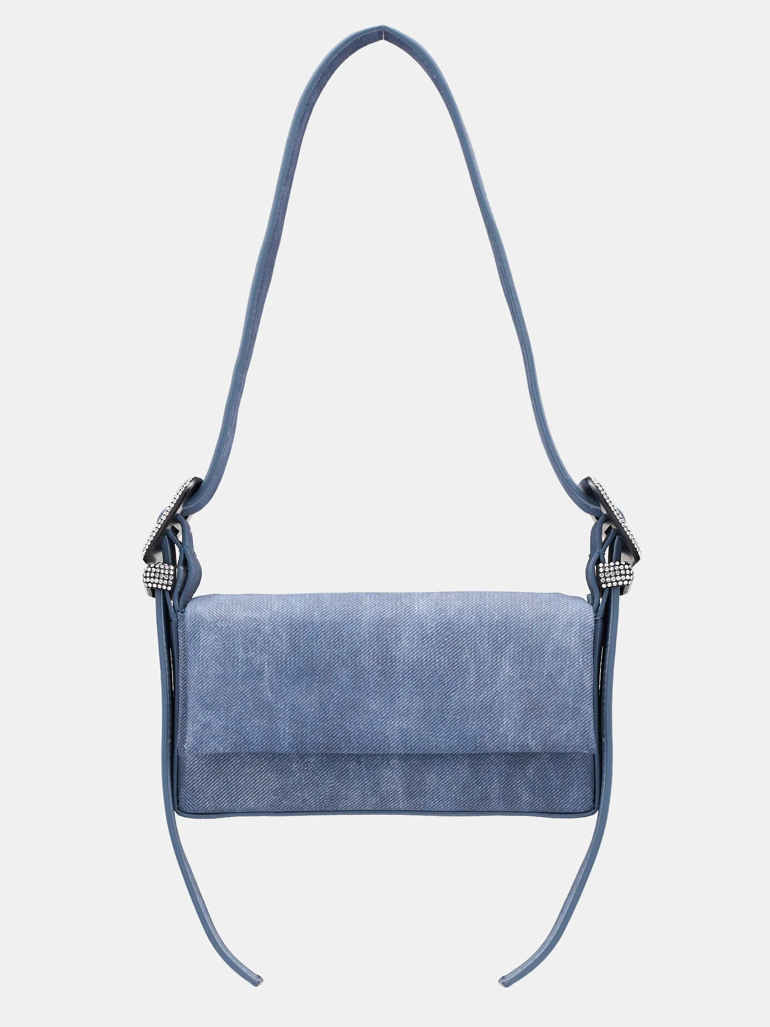 BENEDETTA BRUZZICHES blue handbag, handmade, Nappa leather construction, trompe l'oeil denim pattern, adjustable shoulder strap, rhinestone-encrusted buckles, magnetic flap closure, back branded logo, lined. Made in Italy Outer: 100% Nappa Leather Inner: 100% Silk Satin One Size