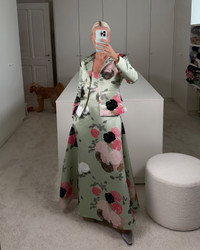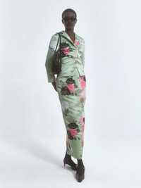 Jacket Elle comes to life in our hand-painted Auscot Rose motif—pink and black on sage green. Crafted in soft silk-satin, this versatile piece can be worn open as a lightweight layer or styled closed for a sleek jacket look. Jacket Elle carries the BERNADETTE print story into everyday dressing. Product information Charlotte is 168cm / 5'6" and wears size EU34. Tumbush is 173 cm / 5’8” and wears size EU36. Jacket Elle is fully lined and fits small to size. Size up for a slightly looser fit. For sizing information, please e-mail sales@bernadetteantwerp.com. Fabrics from Italy Made in Romania 100% PL / LINING: 100% VI