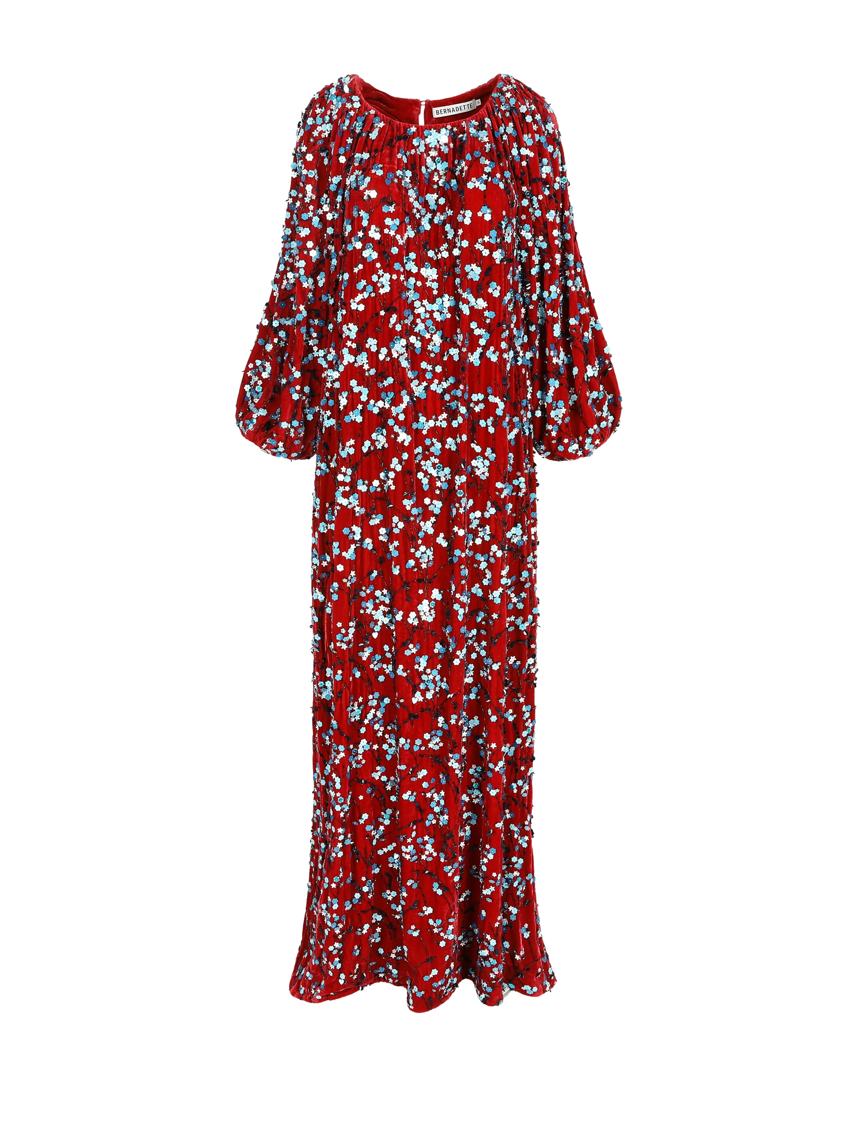 Dress Georgina embodies BERNADETTE's timeless classic shape, elevated by its all-over turquoise hand-embroidered small flowers. Cut from a red silk-velvet fabric, this dress features a crew neckline and long voluminous sleeves, flowing into a floor-length gown. Product information Charlotte is 168cm / 5'6" and wears size EU34. Jools is 176cm / 5'9" and wears size EU36. Dress Georgina fits true to size. For size inquiries, e-mail sales@bernadetteantwerp.com. Made and hand-embroidered in India 82% VI 18% SE / LINING: 100% VI